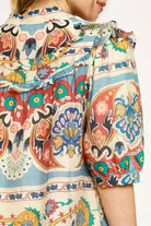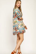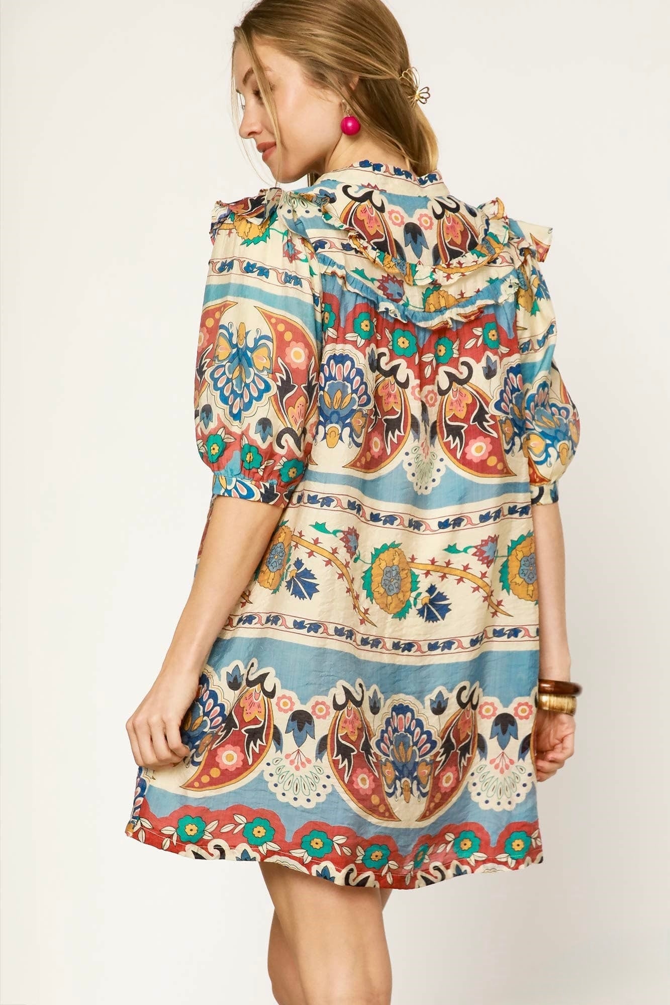 This border print dress is a standout piece with charming, feminine details throughout. Designed with eye-catching border print accents, it features soft ruffle detailing that adds movement and texture, along with playful puff sleeves for a romantic, elevated silhouette. The combination of structure and flow makes it both flattering and easy to wear.