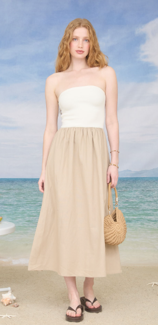 Modern texture meets effortless elegance in this two-tone mixed media midi dress. Designed with a strapless, sleeveless silhouette, the sweater knit bodice offers a sleek, body-hugging fit while the silicone band detail along the neckline provides added support and a secure feel.