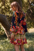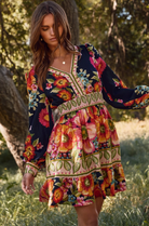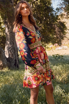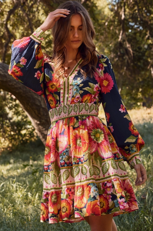 Radiate bohemian charm in this vibrant floral print mini dress, a perfect blend of romantic femininity and effortless style. Crafted from lightweight, breathable fabric, this dress features a deep V-neckline, long billowy sleeves, and an intricately patterned waistband that flatters your figure while adding structure to its flowy silhouette.