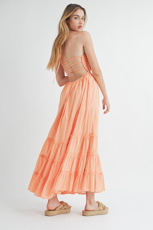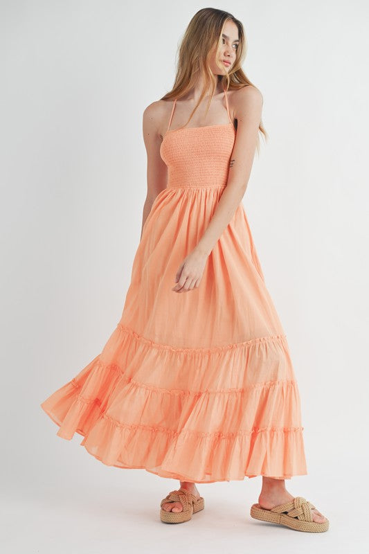 Get ready to turn heads in our Solid Smocked Bust Halter Maxi Dress! This stunning maxi brings elegance and fun together with its smocked bust, flattering halter neckline, and stylish open back with triple elastic straps. The ruffle tiered skirt adds a flowy, twirl-worthy touch, making it perfect for anything from beach days to special nights out. With soft lining for extra comfort, this dress is your new go-to for effortless style!