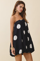 Make a playful yet chic statement in this strapless bubble mini dress. Featuring a bold oversized polka dot print on a sleek black base, this dress brings a fun retro vibe with a modern twist. The voluminous silhouette drapes effortlessly from the elasticized neckline, cinching softly at the hem to create a flirty bubble effect. Perfect for summer parties, date nights, or a night out with friends, this dress pairs beautifully with gold accessories and strappy heels.