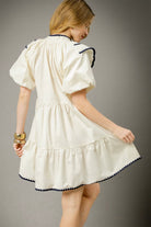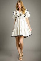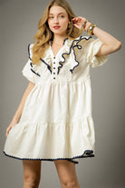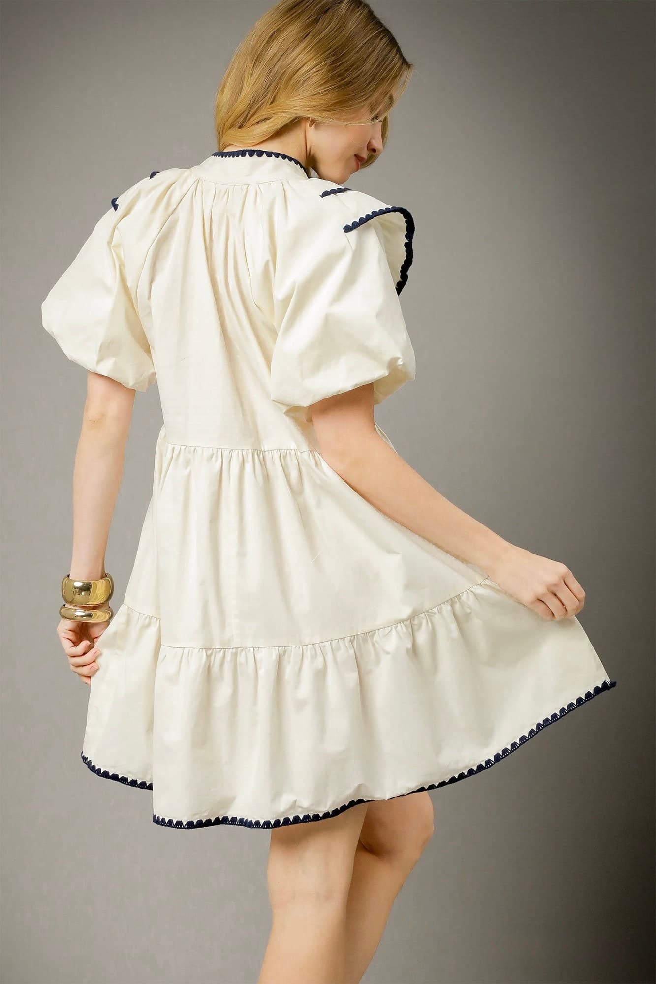 Sweet and feminine, this ruffle trim babydoll dress is full of delicate detail. It features scalloped trim accents, a ruffled V-neckline finished with pearl button detailing, and soft puff sleeves with elastic cuffs for a comfortable, romantic touch. The tiered babydoll silhouette adds flow and movement, while the lining ensures a smooth, flattering fit.