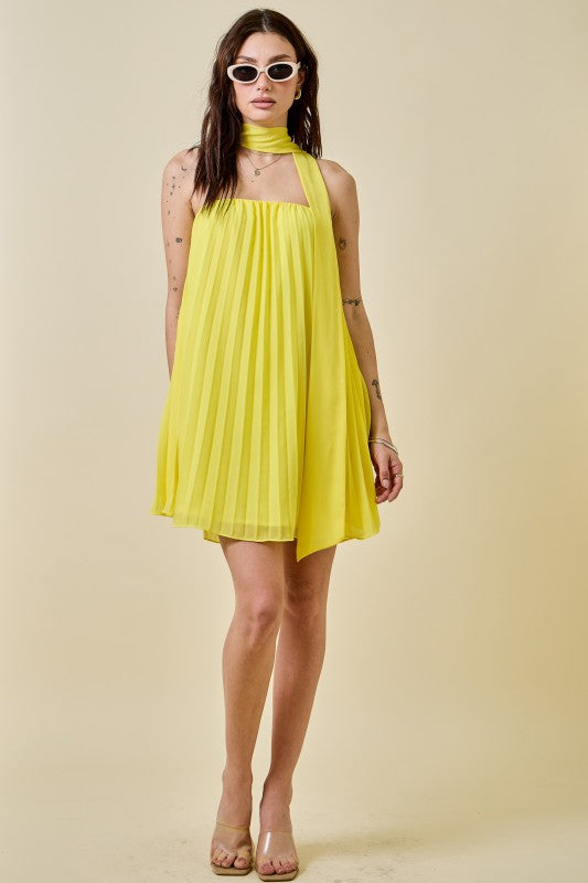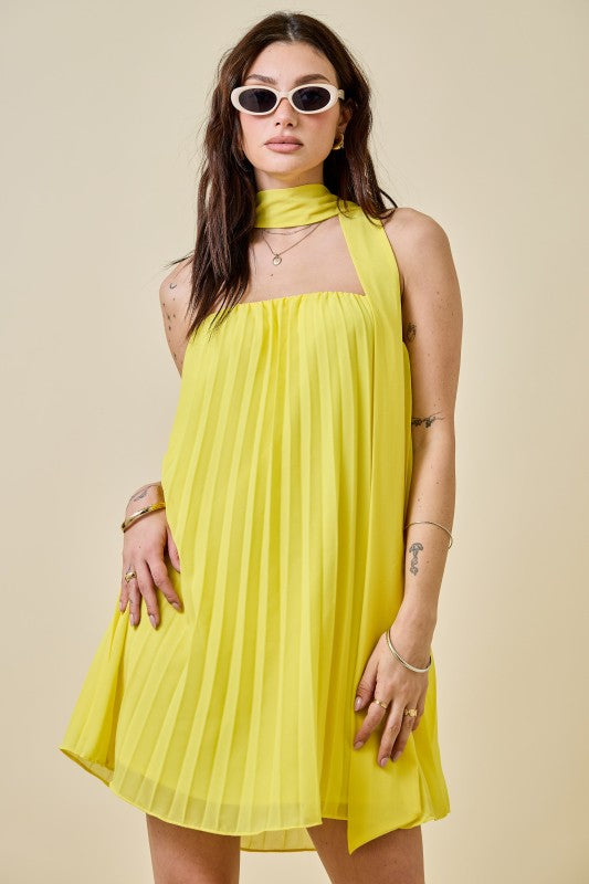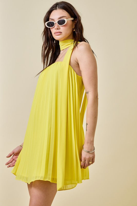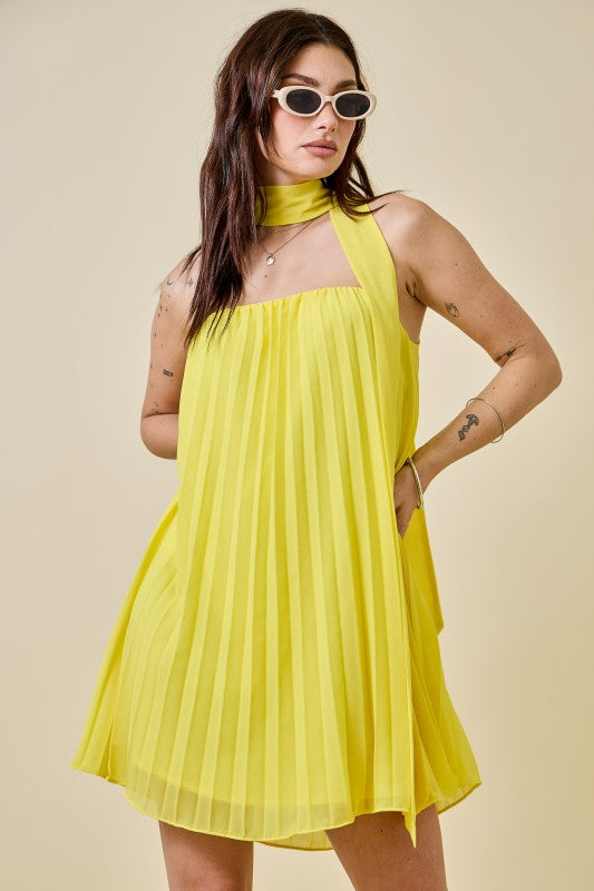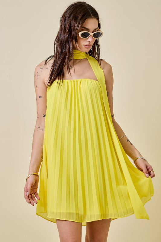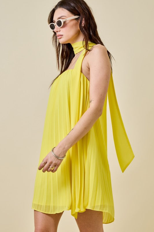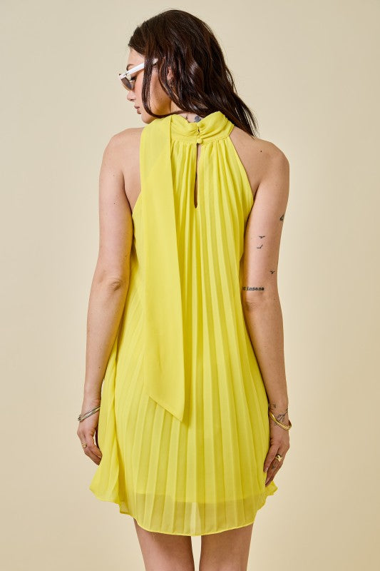 Turn heads at homecoming in this chic pleated mini dress, available in three stunning shades: light blue, sunny yellow, and classic black. The sleeveless silhouette keeps it sleek and modern, while the high neckline ties in a bow at the back for the perfect feminine touch. Flirty, flowy, and oh-so-flattering, this dress is made for dancing the night away.