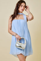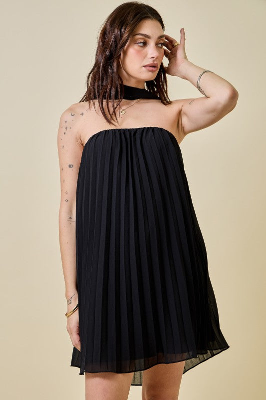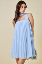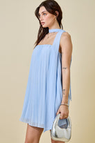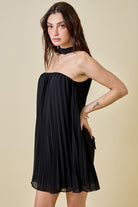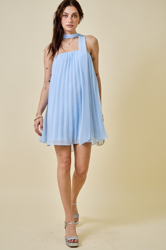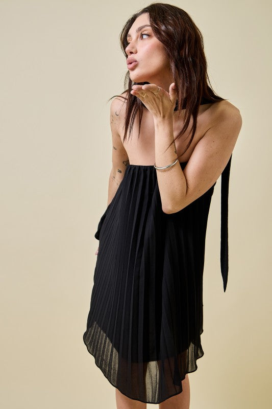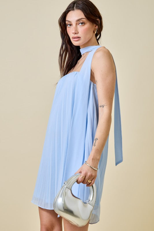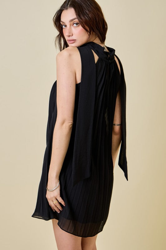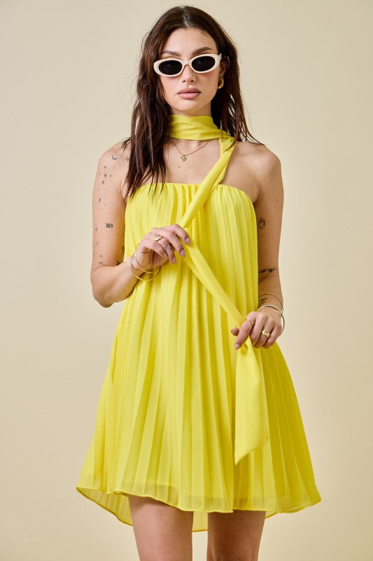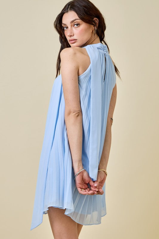 Turn heads at homecoming in this chic pleated mini dress, available in three stunning shades: light blue, sunny yellow, and classic black. The sleeveless silhouette keeps it sleek and modern, while the high neckline ties in a bow at the back for the perfect feminine touch. Flirty, flowy, and oh-so-flattering, this dress is made for dancing the night away.