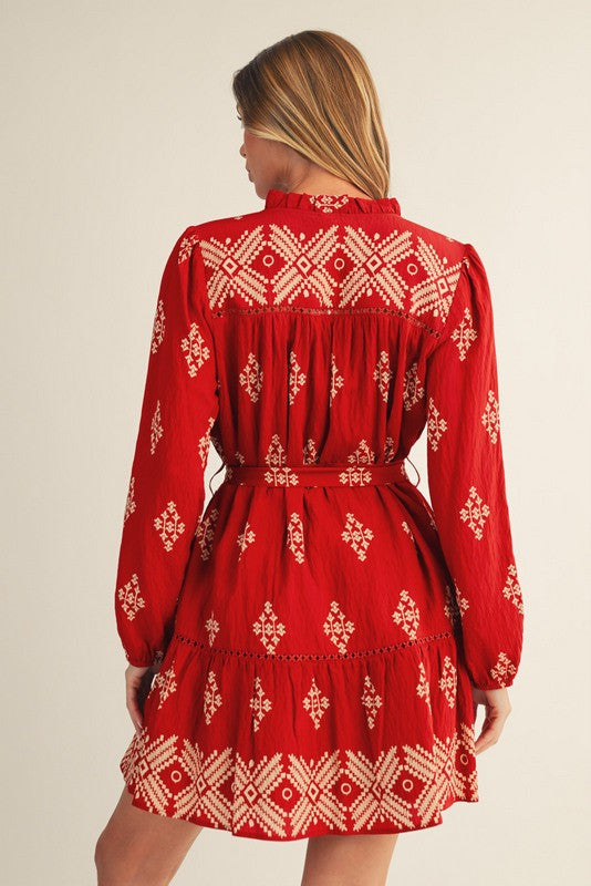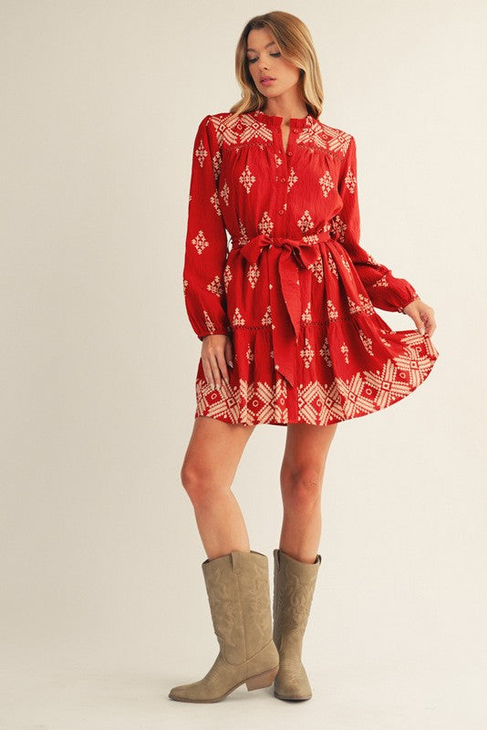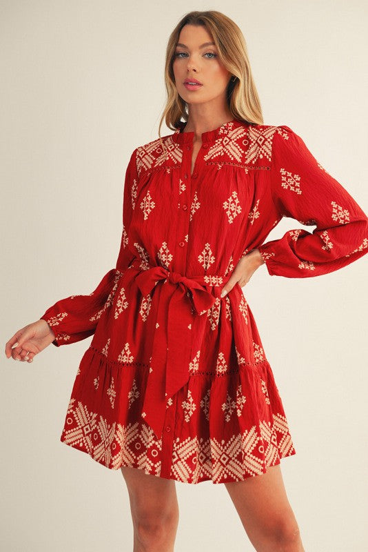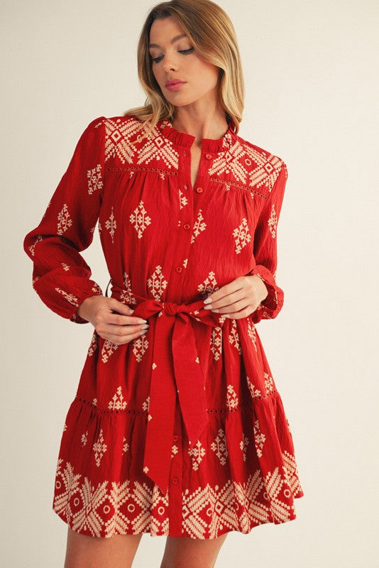 This tribal mini dress is a bold, eye-catching piece with just the right amount of detail. Designed with a front button-down closure and long sleeves, it balances classic structure with vibrant print. The removable tie belt cinches the waist for a flattering silhouette, while the mini length keeps it playful and chic. Perfect for making a statement from day to night.