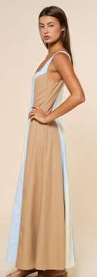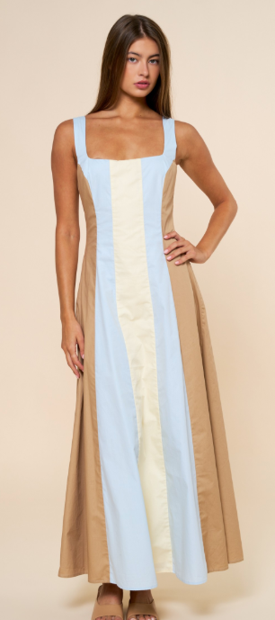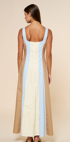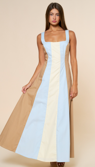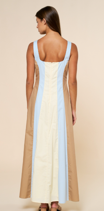 This elegant maxi dress features a clean, structured silhouette accented by vertical colorblock paneling for a flattering, elongating effect. Designed with wide shoulder straps and a modern square neckline, it offers a timeless yet contemporary feel. The tailored bodice flows into a full-length skirt, creating effortless movement and a refined finish.