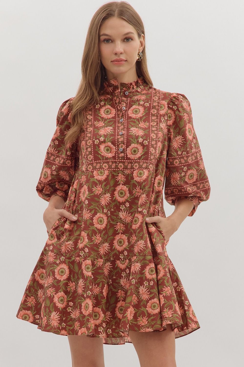 Sweet and timeless, this floral mini dress features 3/4 puff sleeves and a ruffled neck band collar for the perfect touch of femininity. A partial button-front closure adds detail while side pockets bring in functionality. Fully lined in a lightweight woven fabric, it’s breezy, non-sheer, and made for all-day comfort.