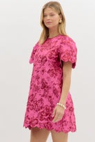 Shine bright this season in our pink floral scalloped dress, featuring a subtle metallic sheen that catches the light with every step. The delicate floral pattern adds a romantic touch, while the scalloped hemline brings playful elegance. Perfect for holiday parties or festive nights out, this dress pairs beautifully with gold earrings for a look that’s both glamorous and feminine. Fully lined for comfort and confidence.