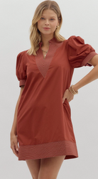 Effortless and chic, the Sienna Mini is a lightweight pullover dress designed in a rich burgundy hue. Featuring short puff sleeves with cuff bands, contrast stitching along the neckline and hem, and side pockets, it combines playful details with everyday functionality. Fully lined for comfort, it’s the perfect piece to dress up or down for any occasion.