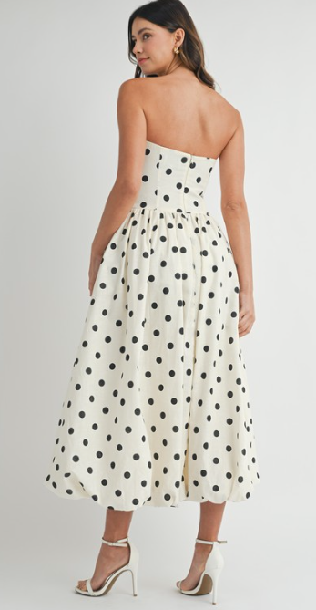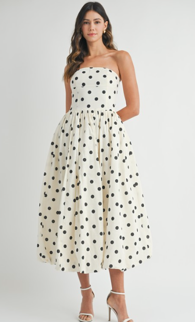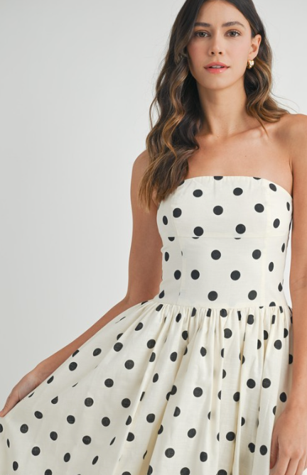 Turn heads with this timeless white strapless dress accented with classic black polka dots. Designed with a clean, structured neckline and a secure, stay-put bodice, this dress offers a flattering silhouette that highlights the shoulders and collarbone. The lightweight fabric drapes effortlessly, creating a chic, feminine shape perfect for warm weather or special occasions. Playful yet sophisticated, this polka-dot piece transitions seamlessly from daytime outings to evening events. Pair it with heels for a polished look or sandals for effortless charm.