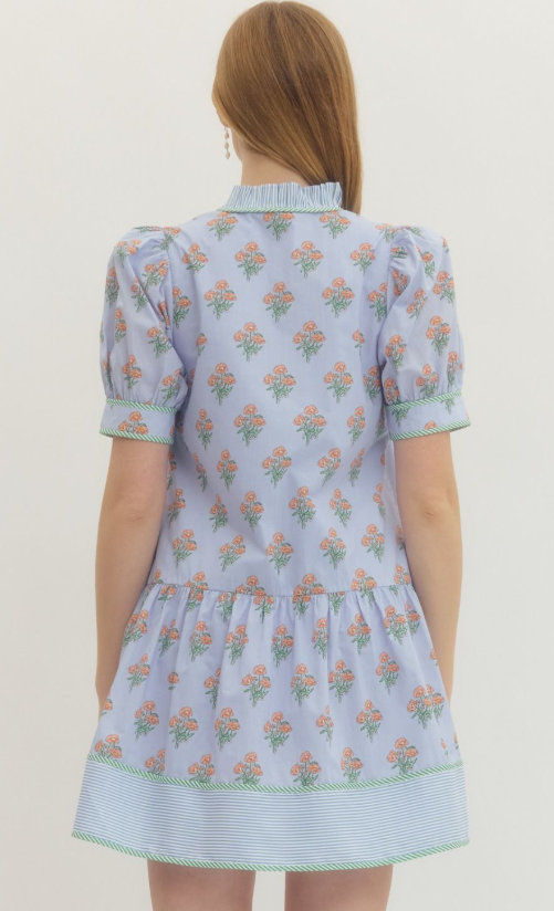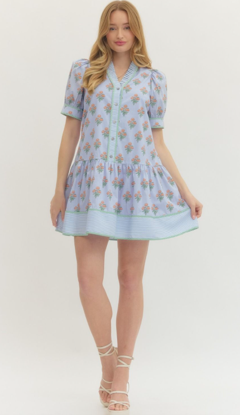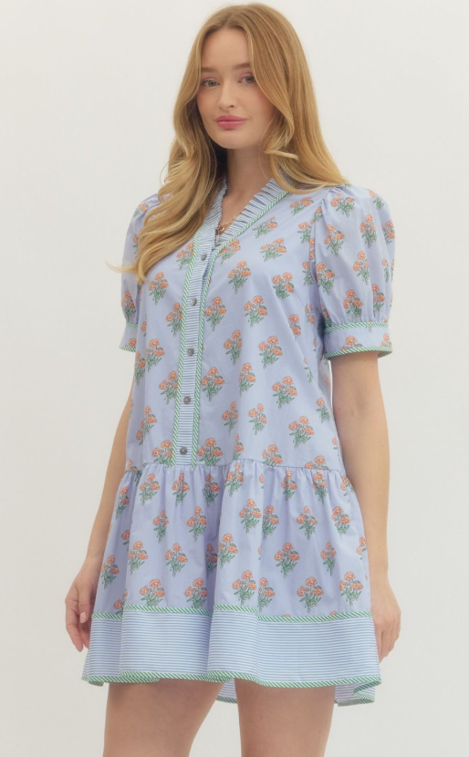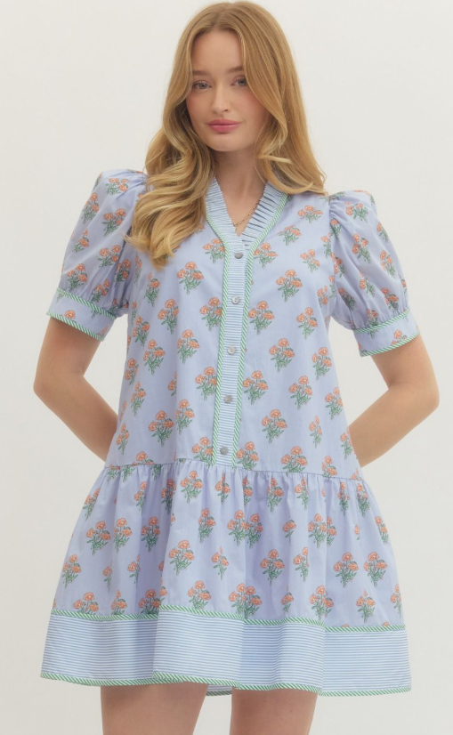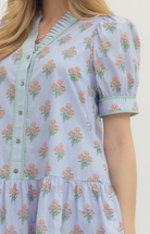 Playful and feminine with a modern twist, this floral print mini dress features short puff sleeves and a ruffled neckline for a romantic, airy look. Striped contrast trim along the edges and a button-front closure add subtle visual interest, while side pockets provide everyday practicality.