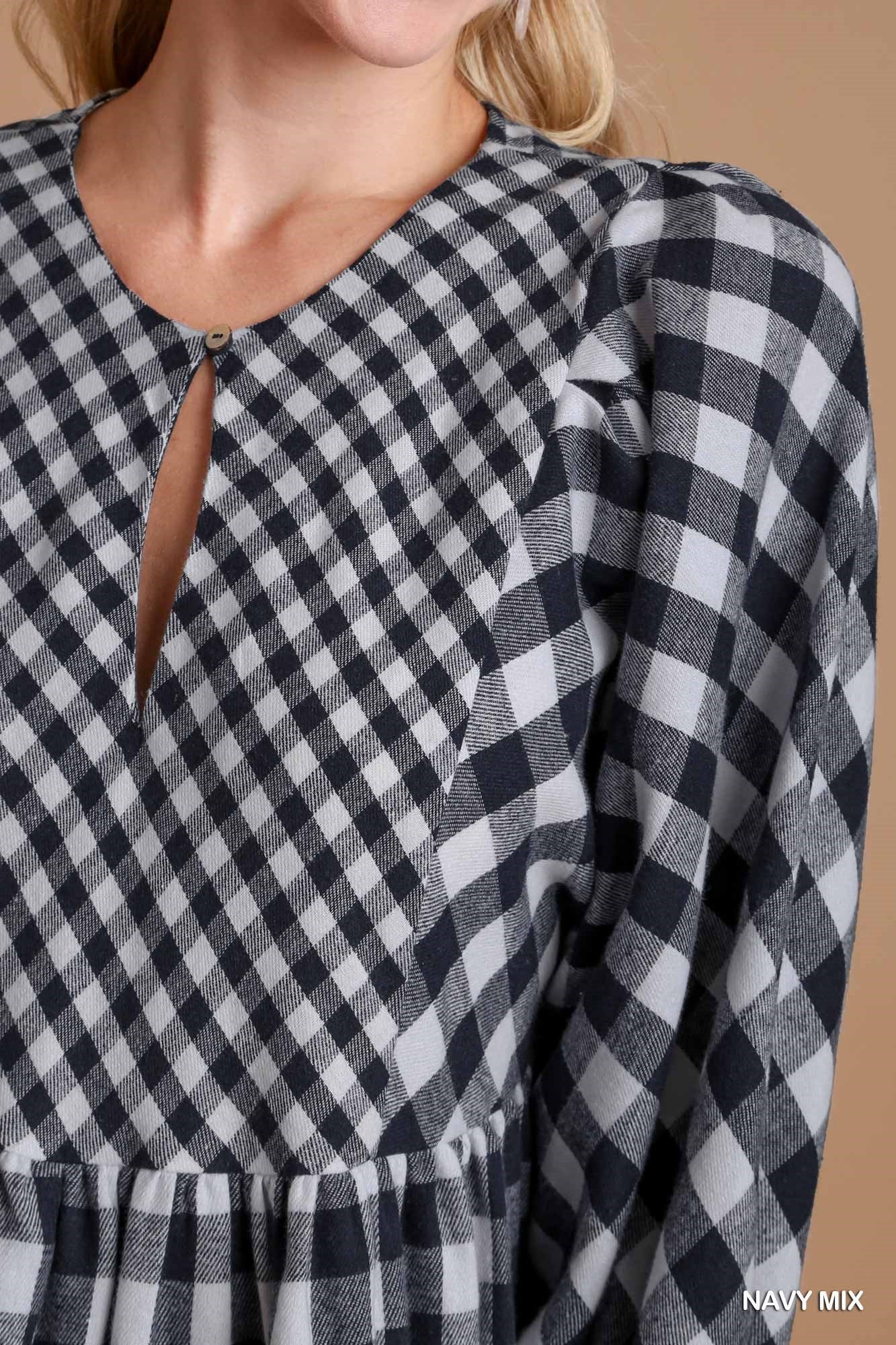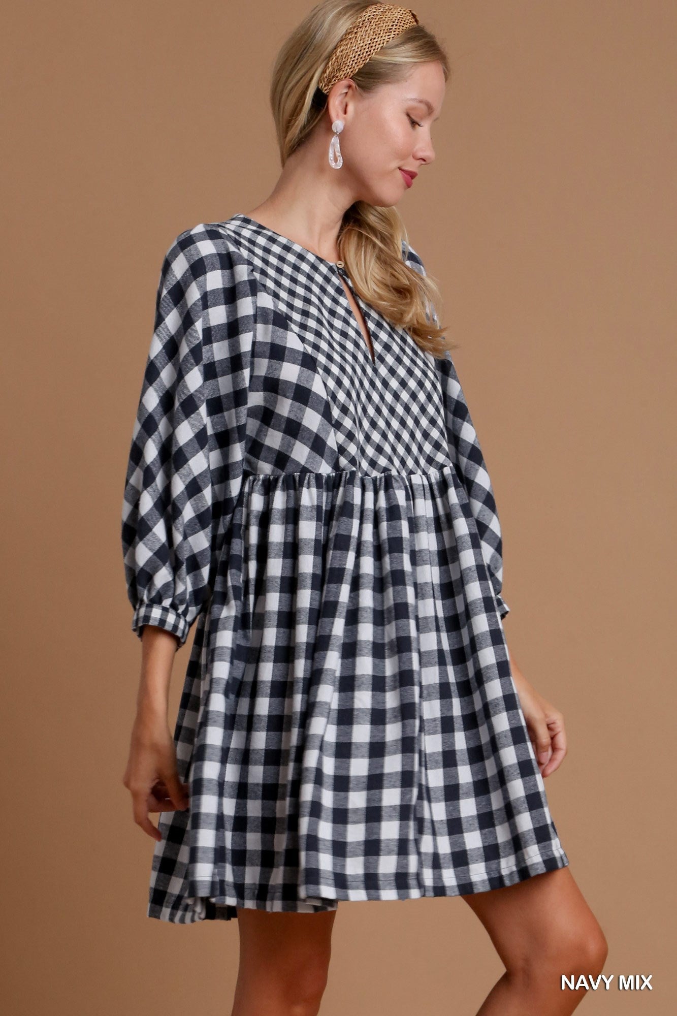 The Willow Dress is the perfect blend of comfort and charm! This navy contrast plaid baby doll dress features three-quarter sleeves and a breezy, throw-on-and-go fit that keeps things effortlessly cute. A dainty button enclosure at the top adds just the right touch of detail. Easy, flattering, and timeless — it’s a dress you’ll love for any day of the week.