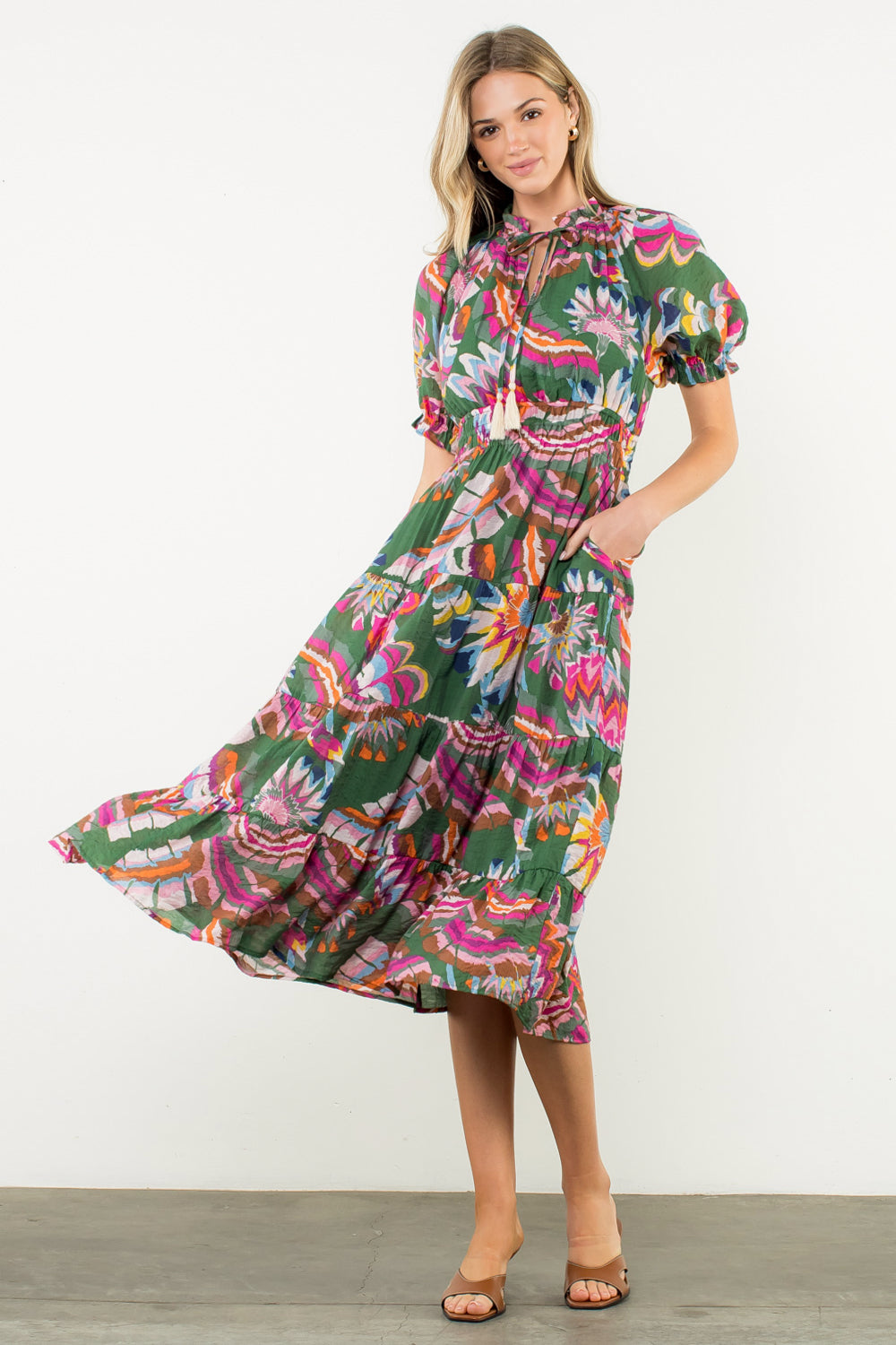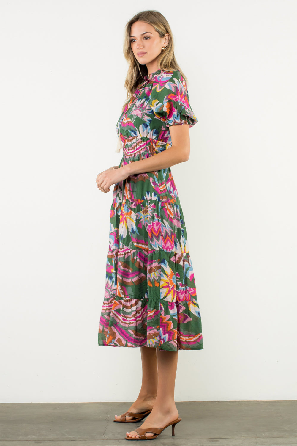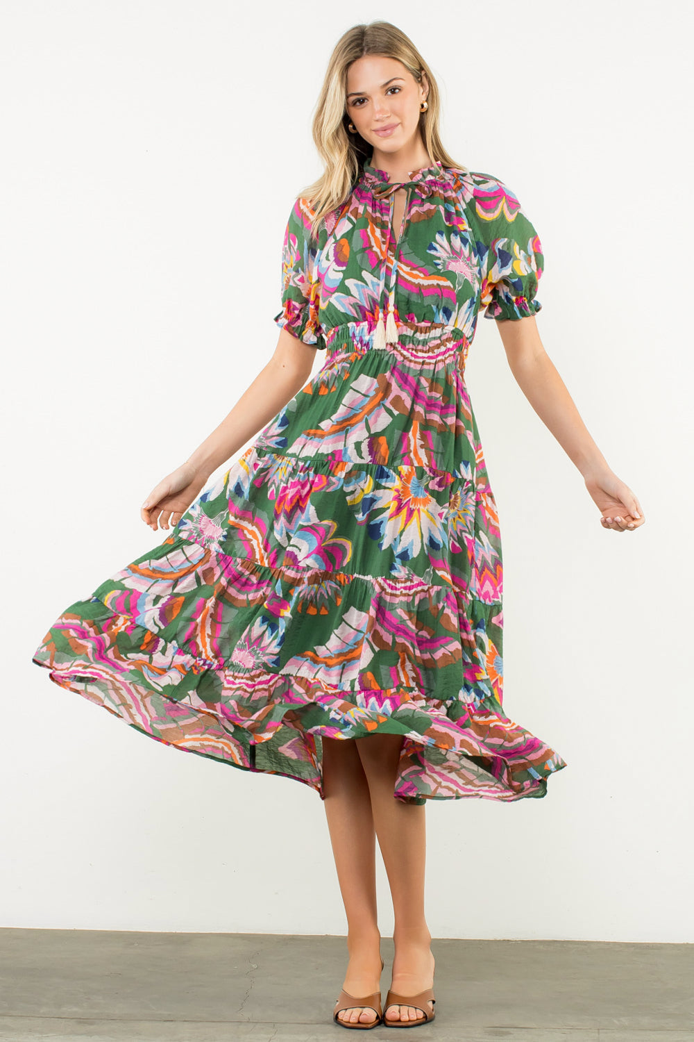 Flowy, feminine, and fall-perfect 🍁 This THML stunner features rich autumn tones and a gorgeous pattern. True-to-size fit you’ll love—style with heels or boots and toss on a cozy cardi for that effortless fall vibe.