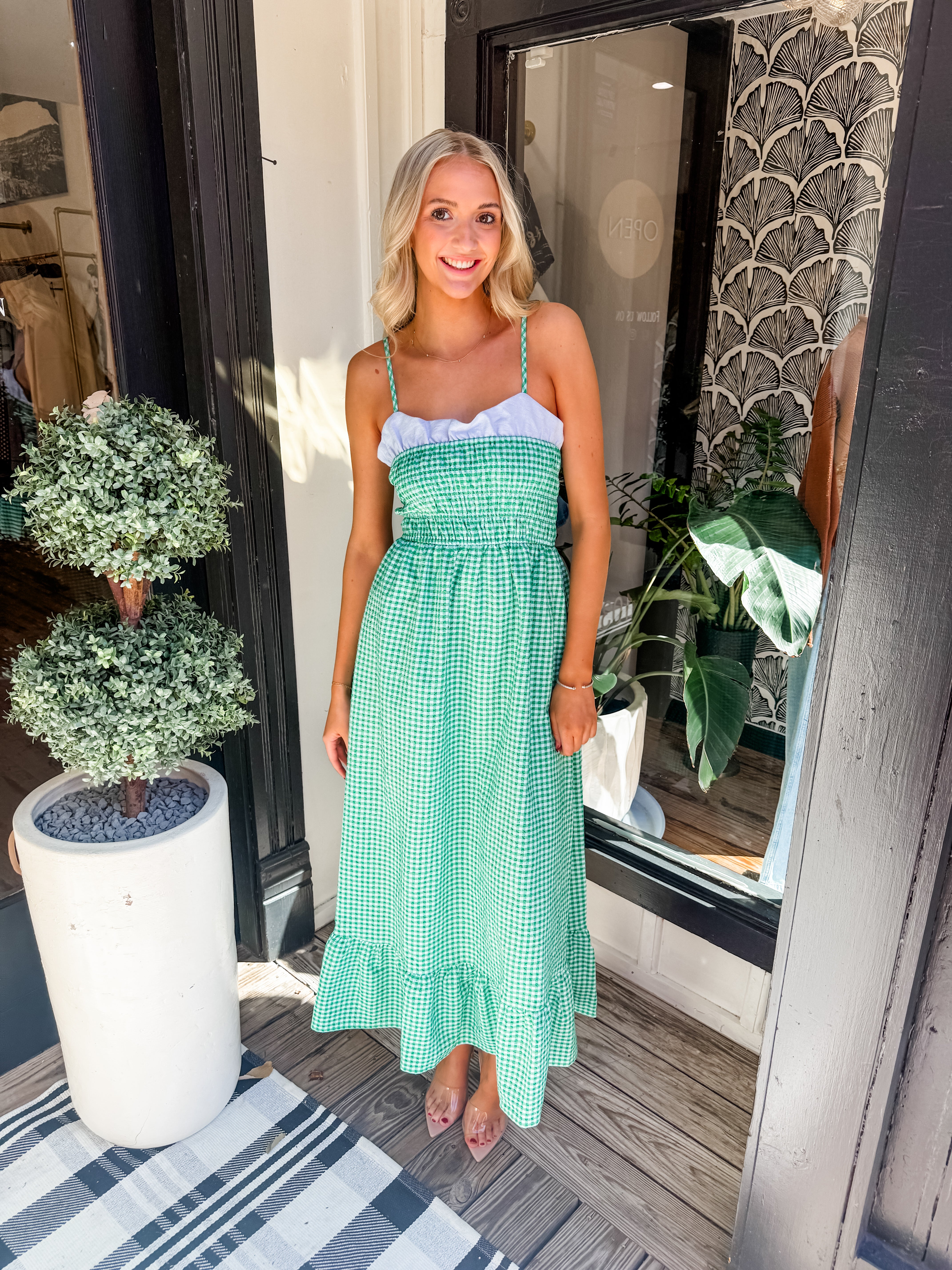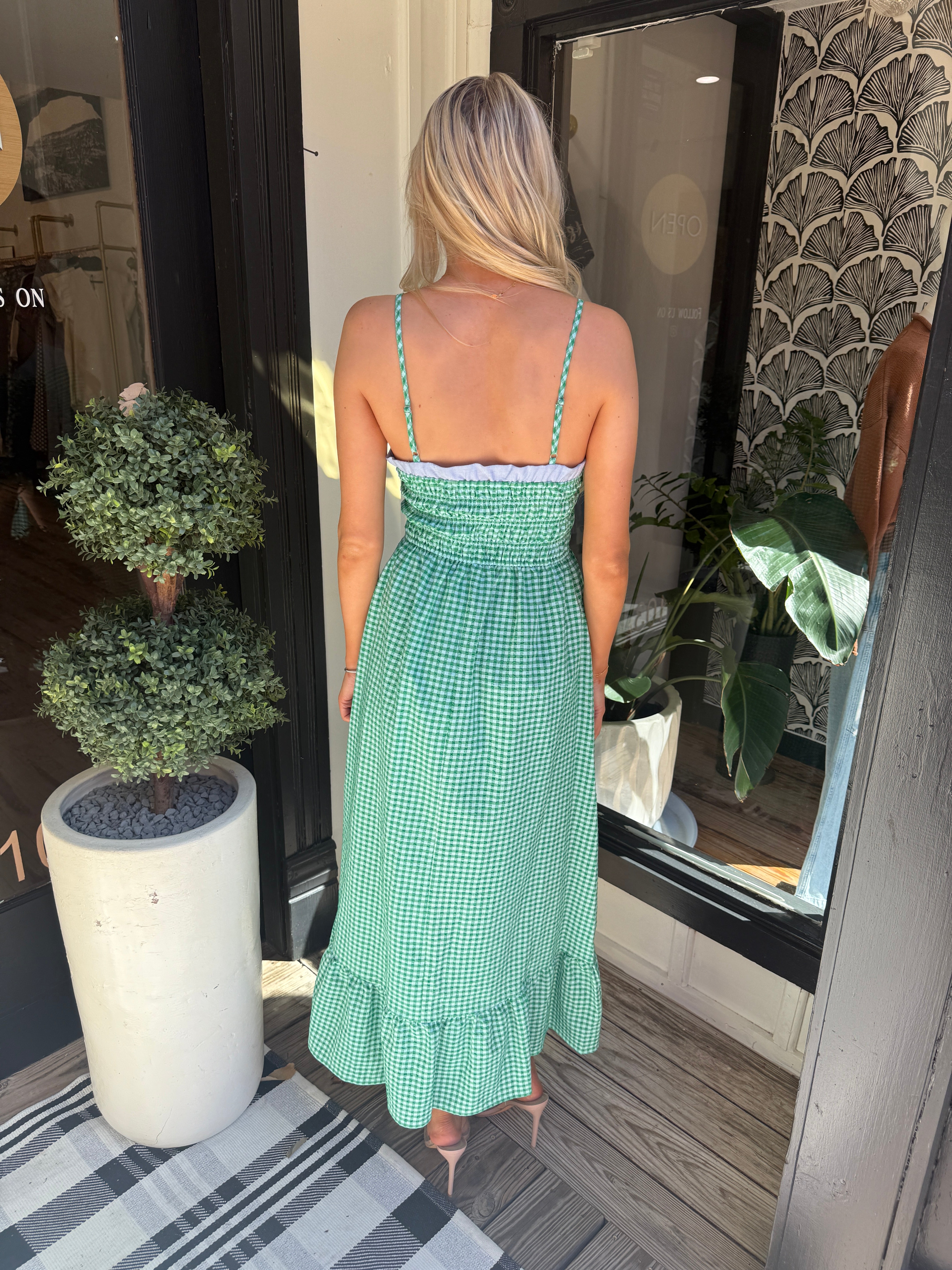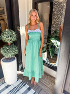 Easy, breezy, and made to twirl ✨ This THML maxi features a comfy smocked bodice, dainty thin straps, and a flowy silhouette in the prettiest pop of green. Just add sandals and sunshine.