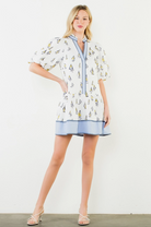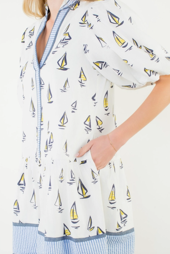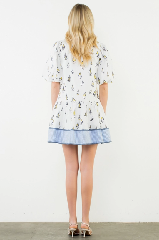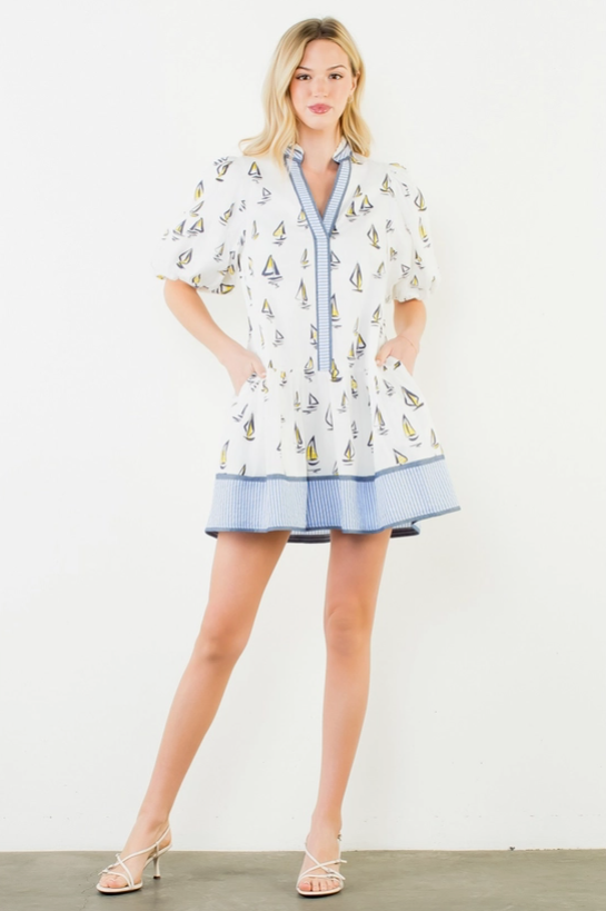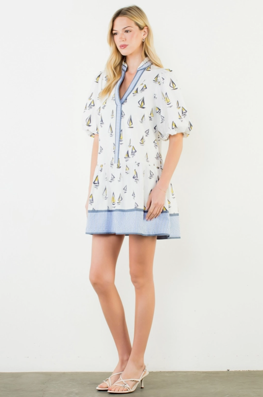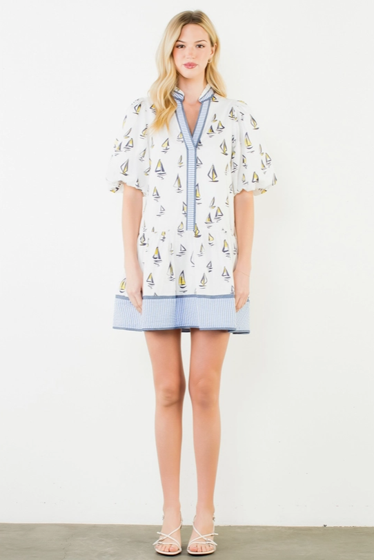 Set sail in style with this charming puff sleeve dress featuring a playful sailboat pattern. Lightweight and breezy, it’s designed with soft puff sleeves and a relaxed silhouette for a flattering, easy-to-wear fit.