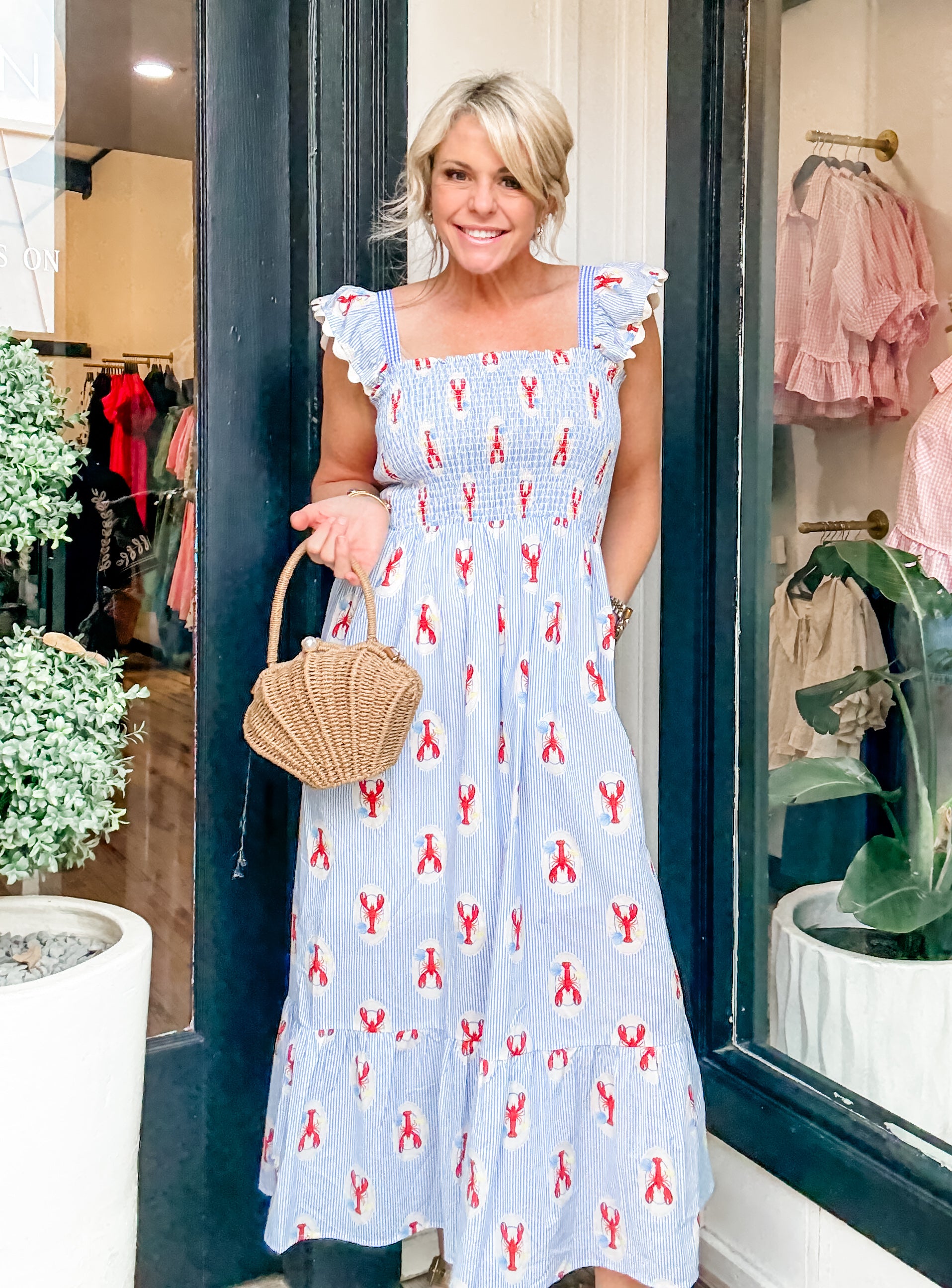 Playful meets polished 🦞 This THML midi features a flattering smocked bodice and a fun lobster print that’s perfect for coastal days, summer dinners, and everything in between. Easy, comfy, and full of personality.