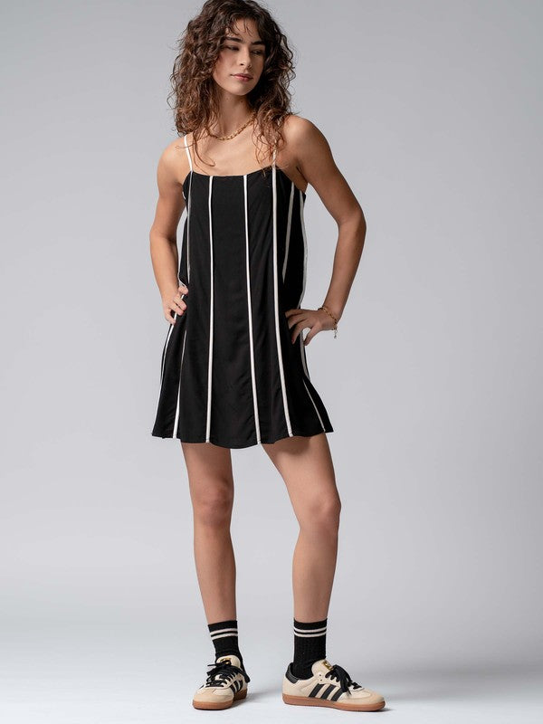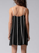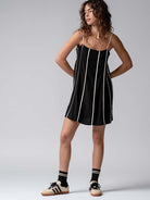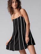 Breezy, boho, and totally effortless—this A-line mini dress is made from a lightweight, breathable fabric that keeps you cool while looking chic. The black base with soft white stripes adds a timeless vibe, while the relaxed A-line cut gives it that carefree silhouette we love. Pair it with sandals and layered jewelry for an easy summer look, or toss on a denim jacket and boots to carry it into fall.