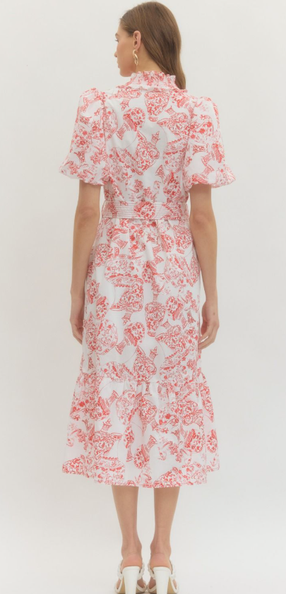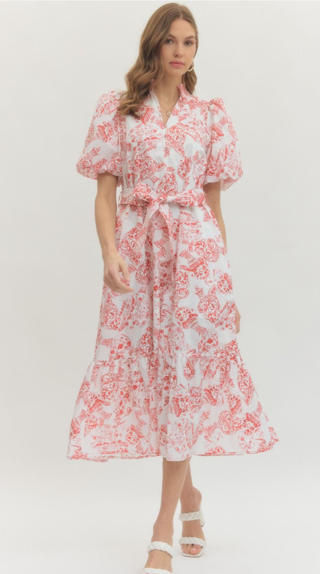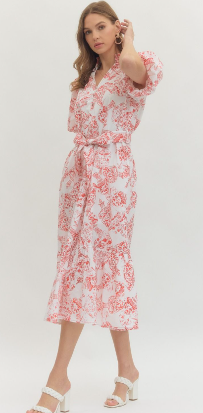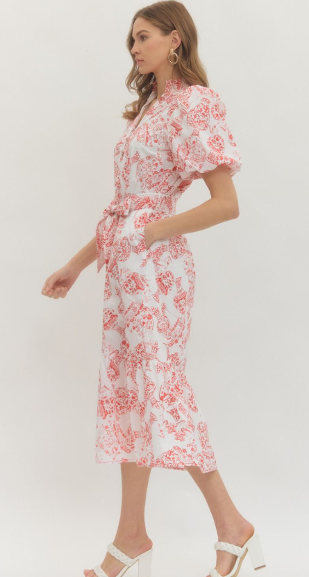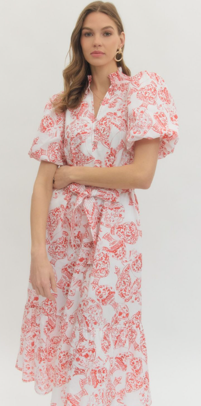 Romantic and effortlessly feminine, this printed midi dress is designed with soft puff sleeves and a ruffled neckline that adds graceful movement and charm. A button-front closure brings a classic touch, while the adjustable self-tie belt cinches the waist for a flattering, customizable fit.