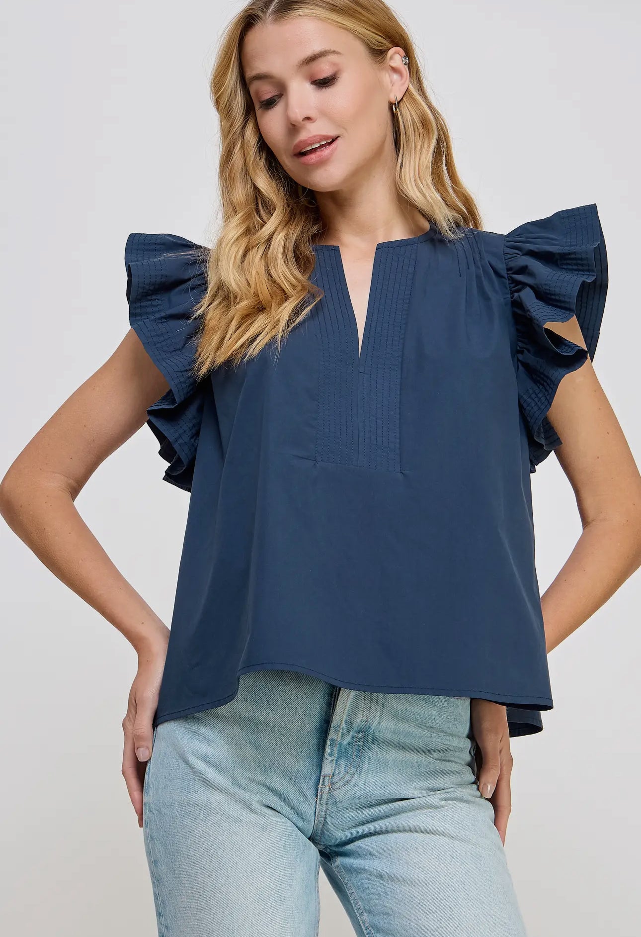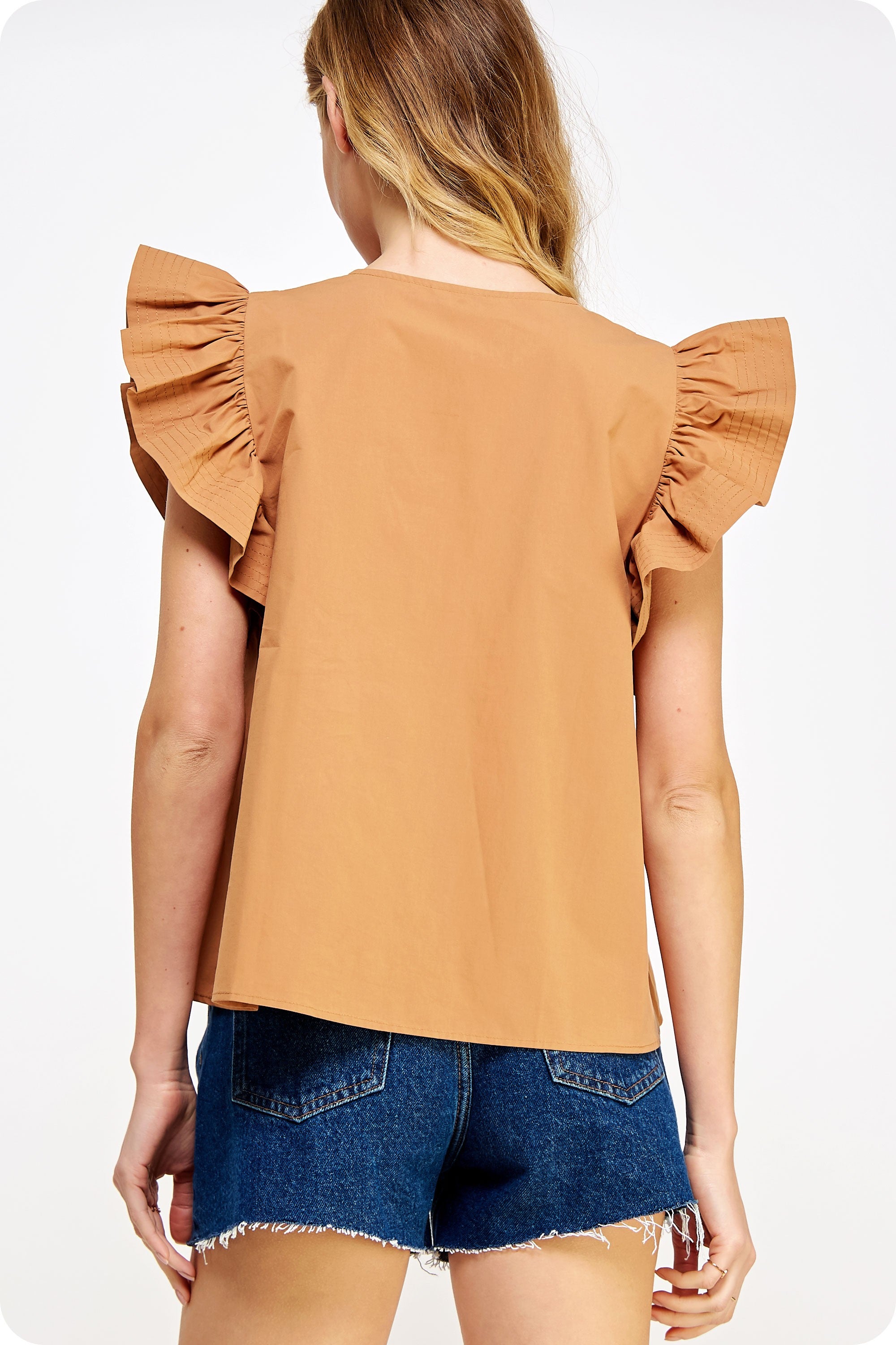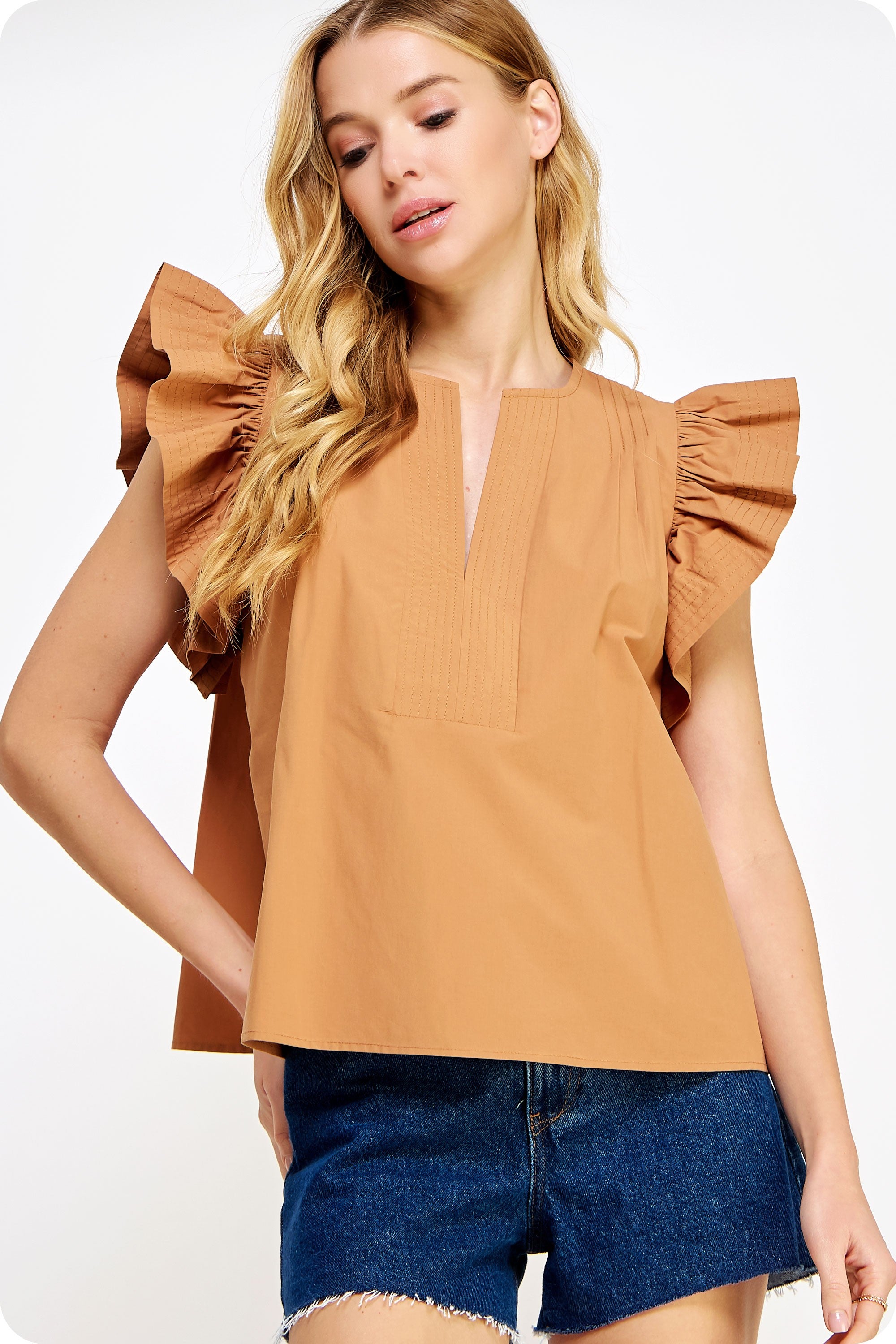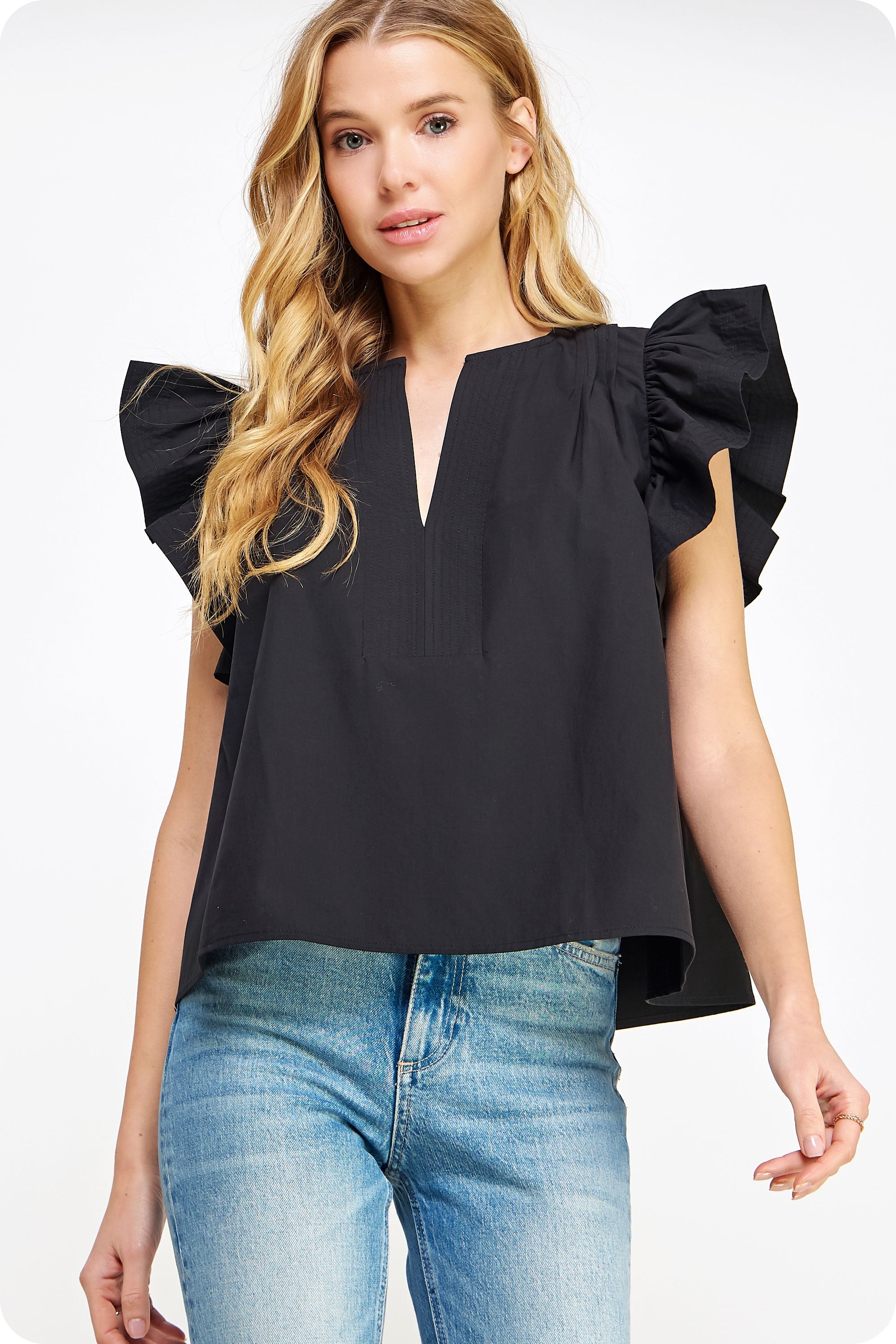 Introducing the Francis Flutter Sleeve Top. Made from luxurious cotton poplin, this blouse features delicate flutter ruffled sleeves and a split V neck line. With top stitch and pintuck details, it exudes a feminine and elegant look. Look effortlessly stylish and confident in this versatile top!
