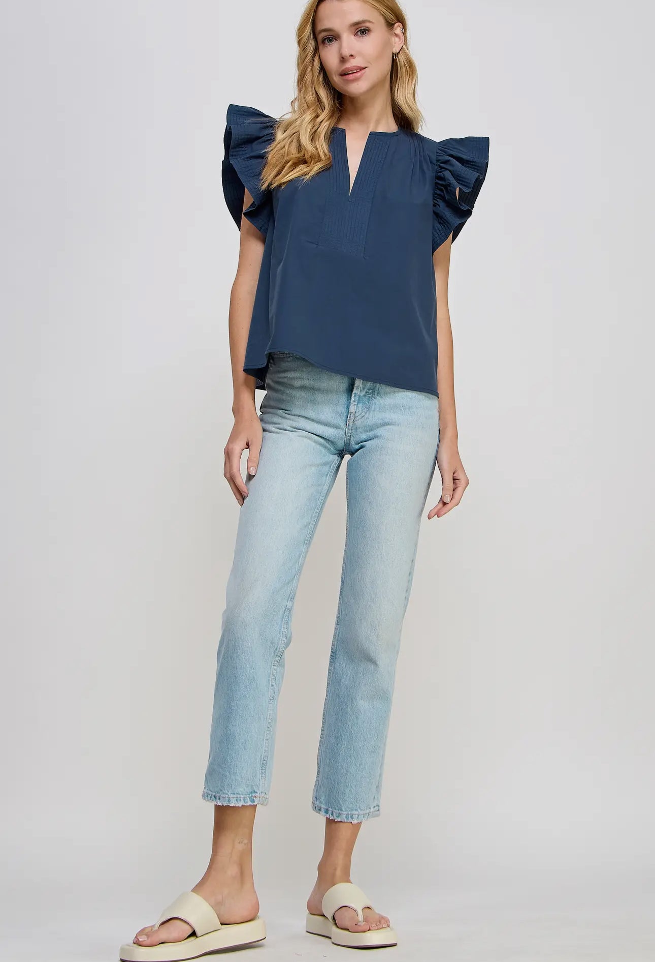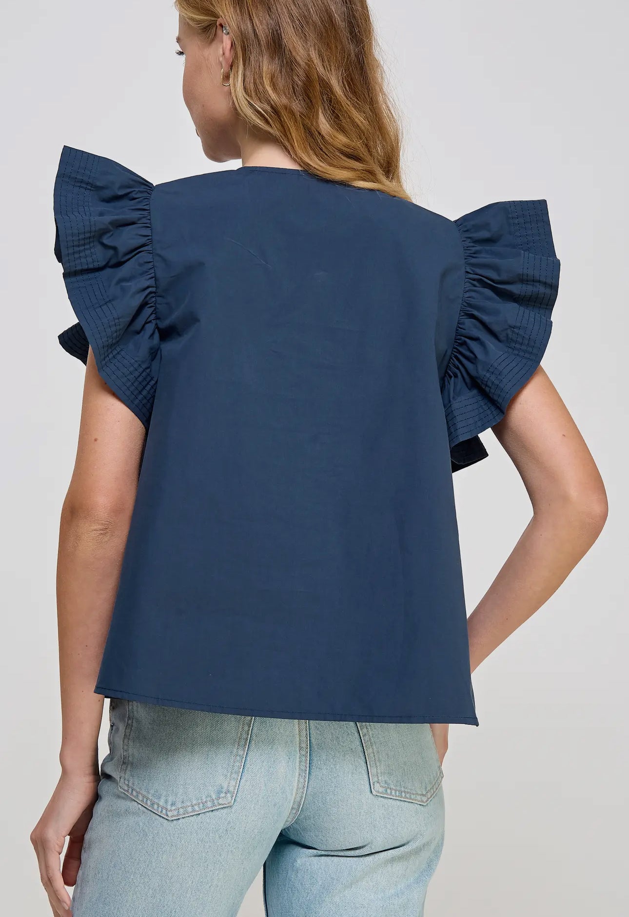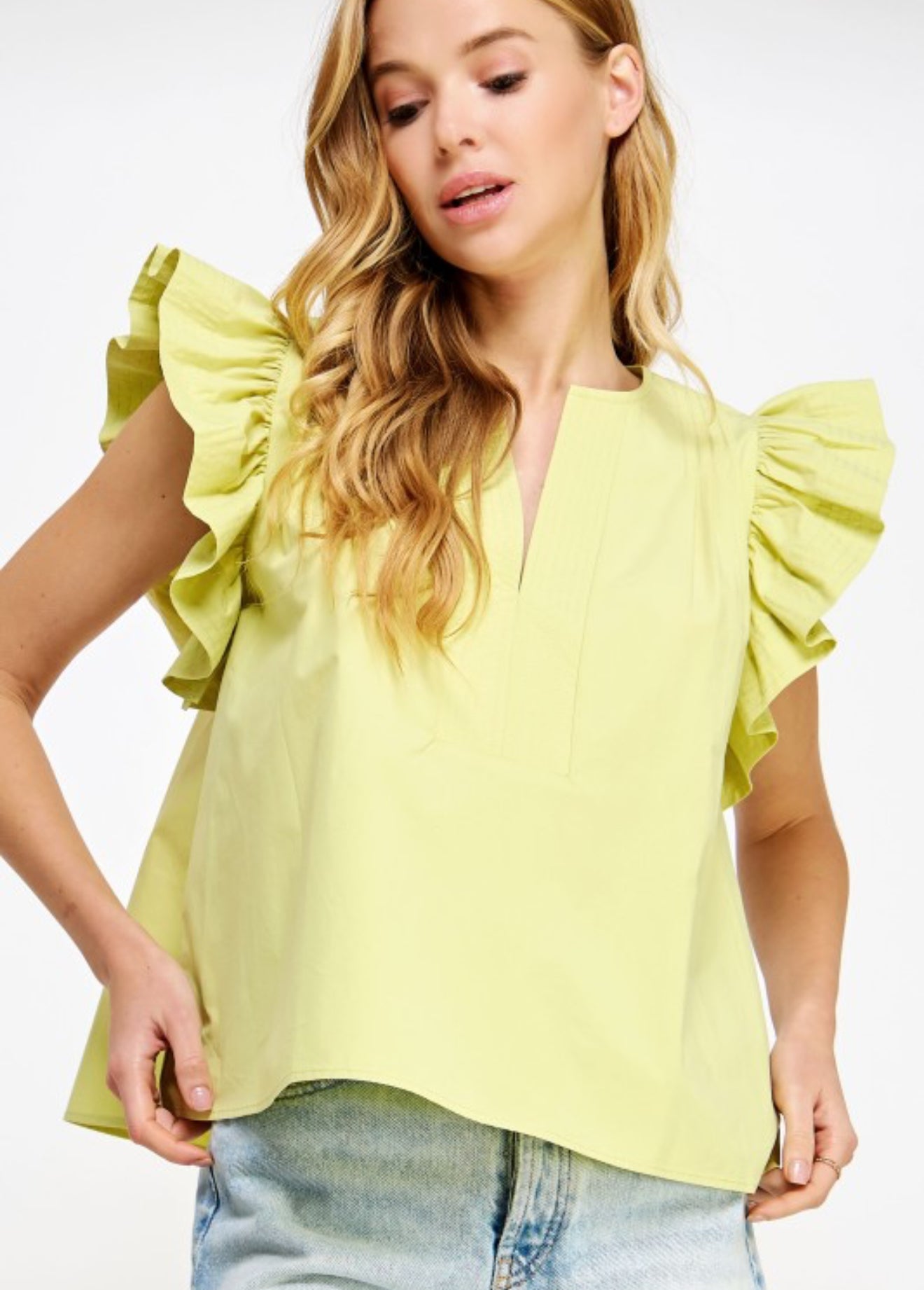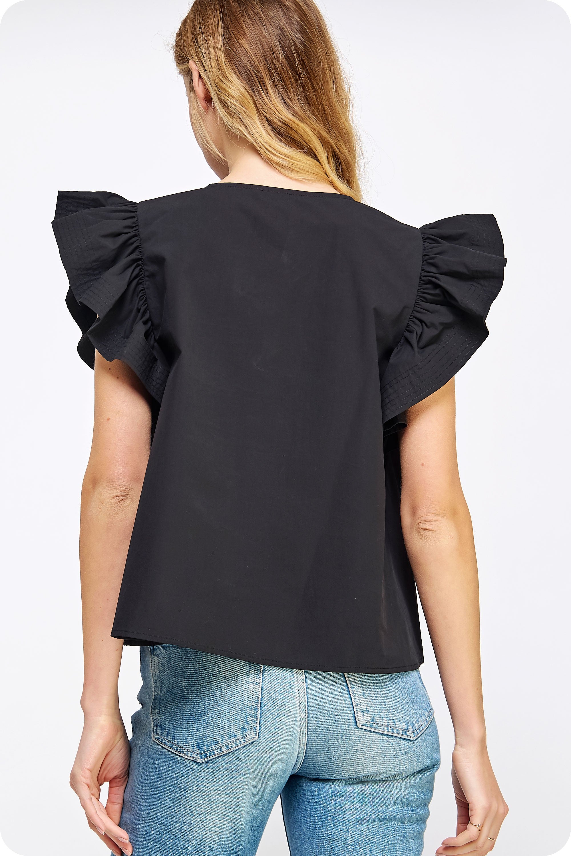 Introducing the Francis Flutter Sleeve Top. Made from luxurious cotton poplin, this blouse features delicate flutter ruffled sleeves and a split V neck line. With top stitch and pintuck details, it exudes a feminine and elegant look. Look effortlessly stylish and confident in this versatile top!