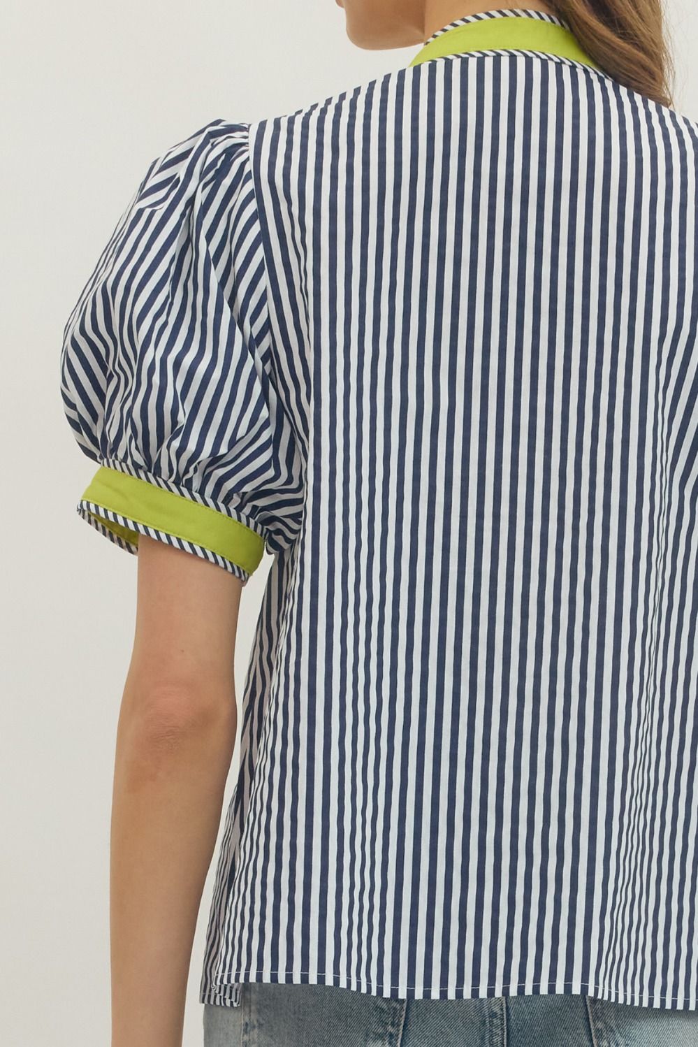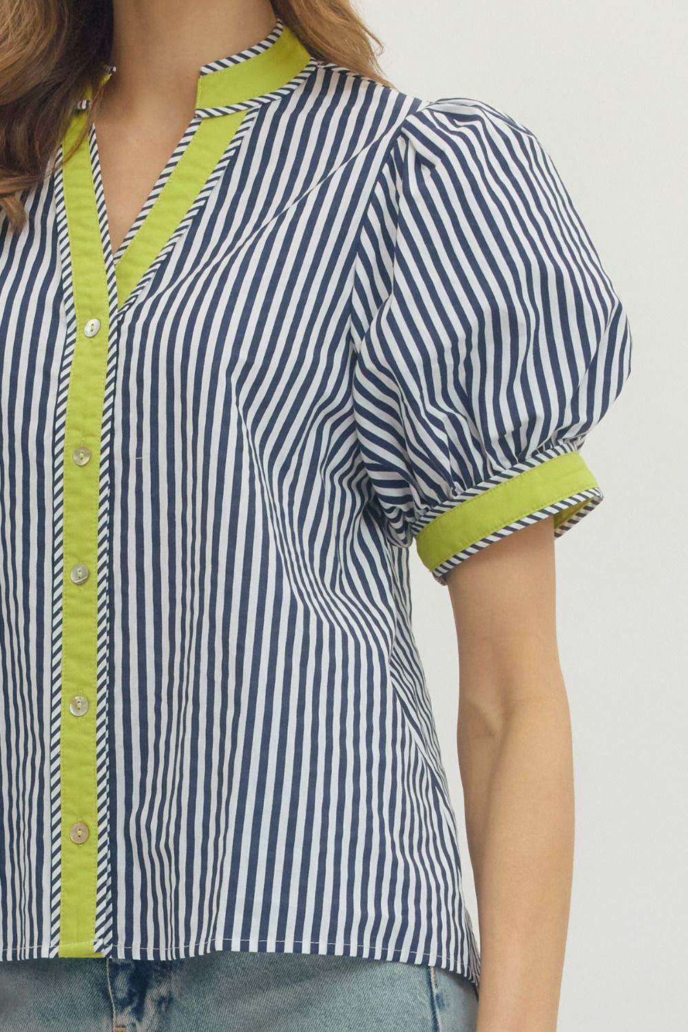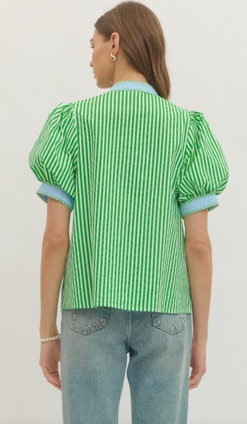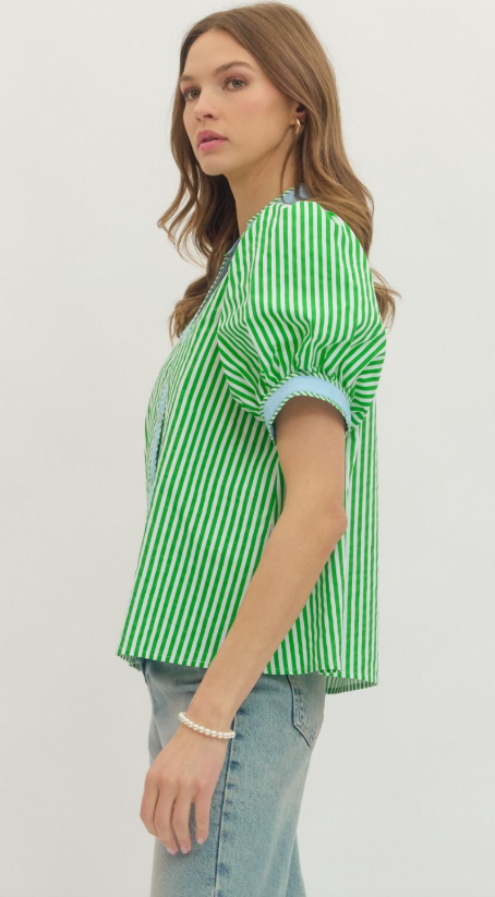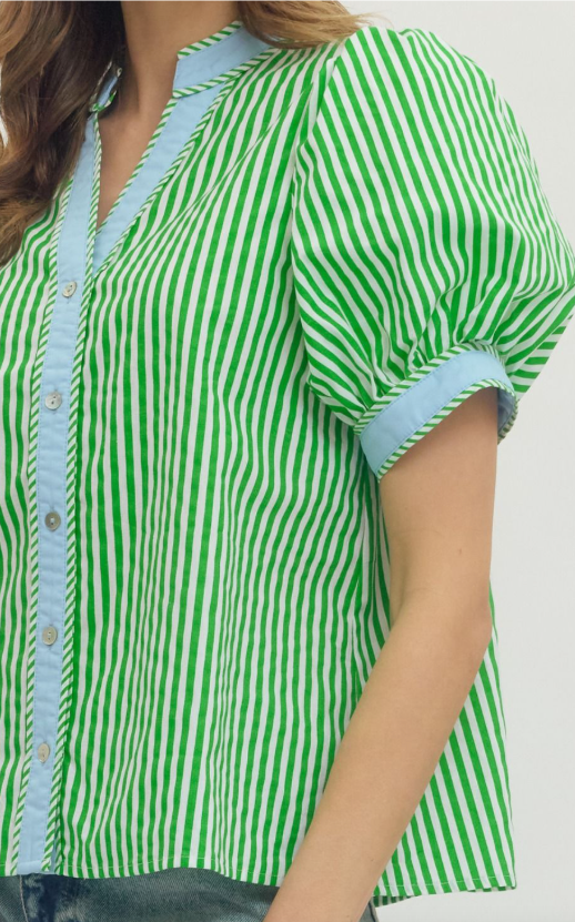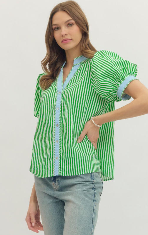 Fresh and effortlessly polished, this stripe print short puff sleeve top blends classic pattern with modern detail. Designed with a flattering V-neckline, it features contrast binding that adds a crisp, eye-catching finish.