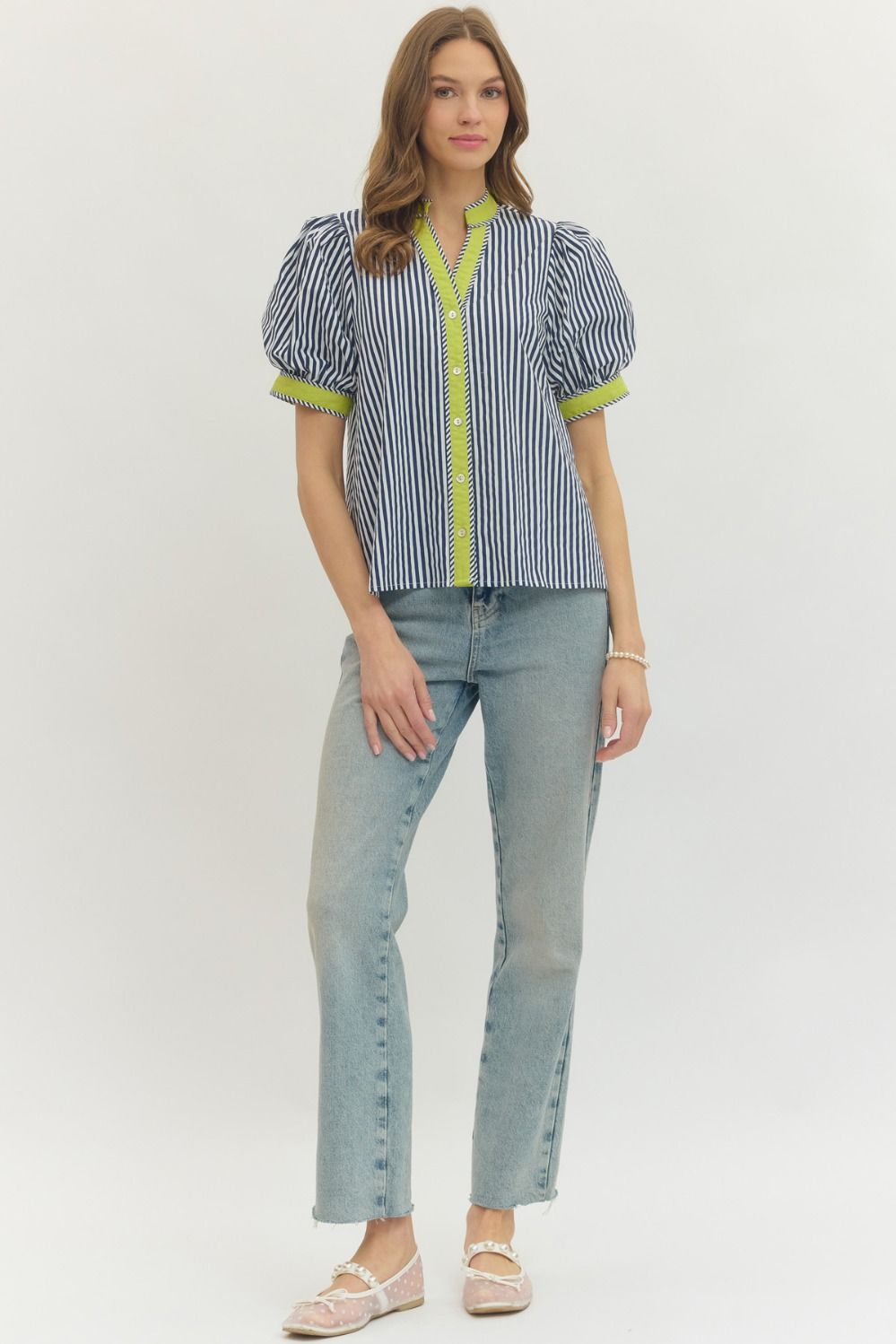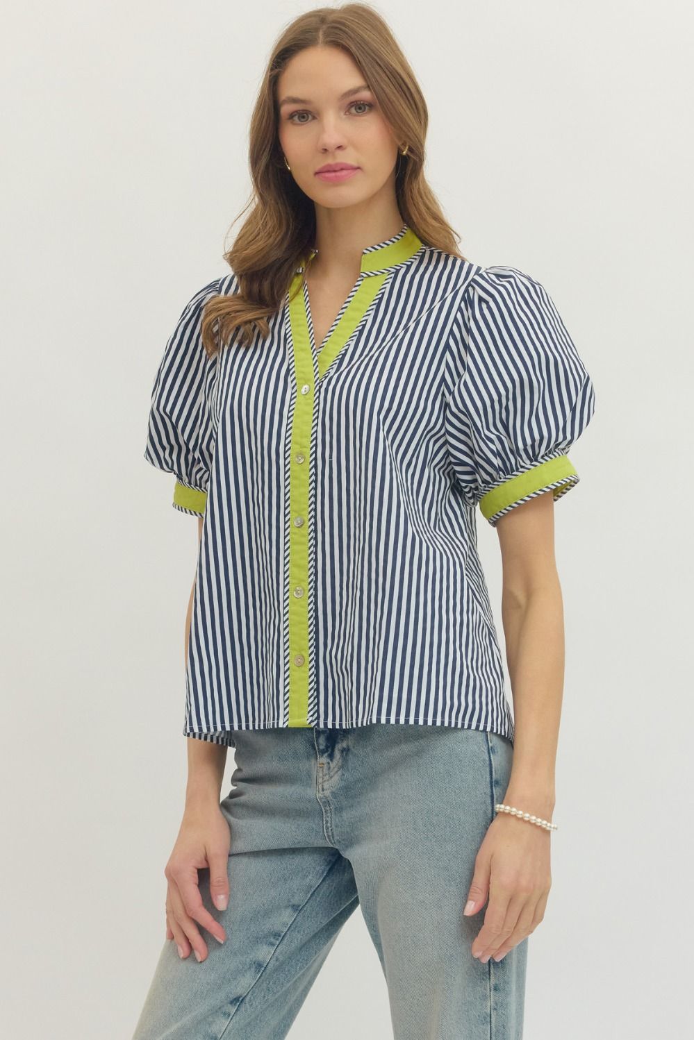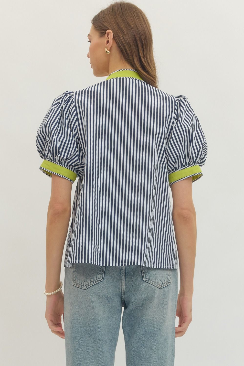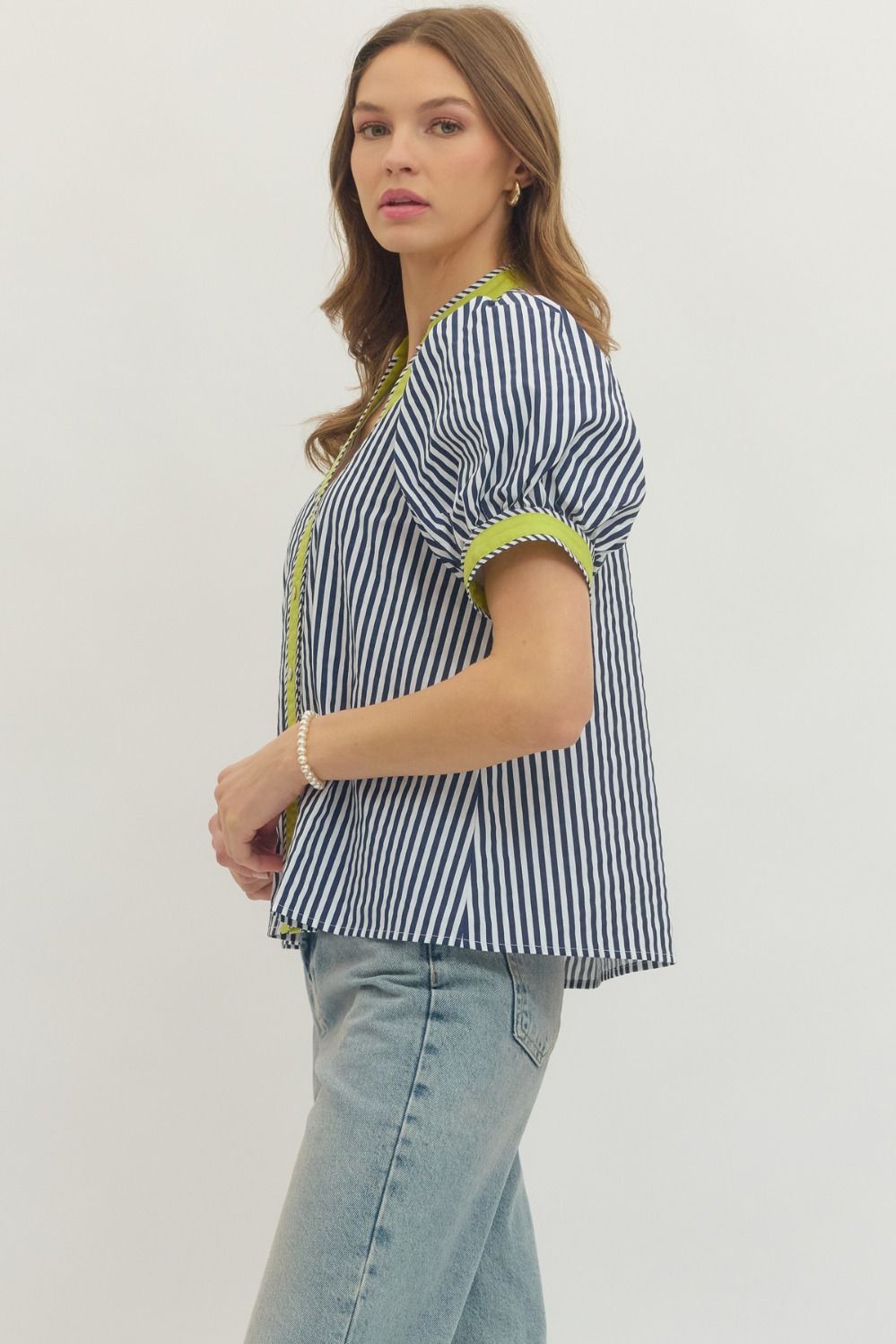 Fresh and effortlessly polished, this stripe print short puff sleeve top blends classic pattern with modern detail. Designed with a flattering V-neckline, it features contrast binding that adds a crisp, eye-catching finish.