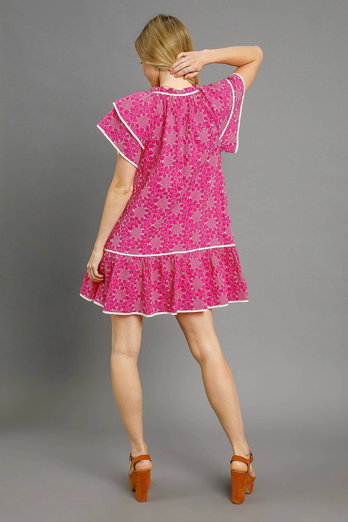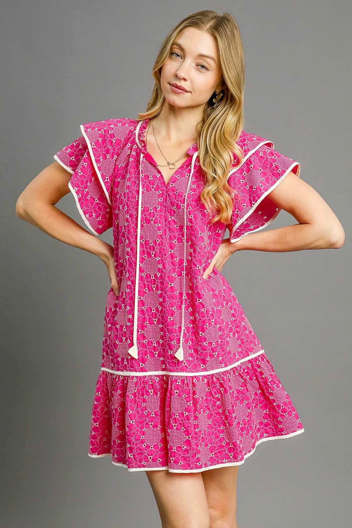 Sweet, airy, and effortlessly feminine — this tiered mini dress is what summer daydreams are made of. Crafted from allover floral-inspired eyelet fabric, it features a V-neckline with adjustable tassel ties, soft flutter sleeves, and a flowy tiered skirt that moves beautifully with every step. Fully lined for easy wear, it’s the perfect blend of comfort and charm.