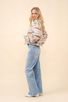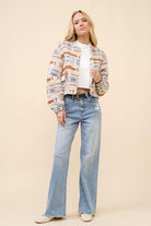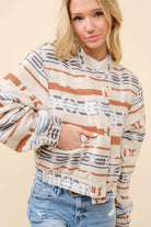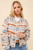 Turn heads and steal hearts with this fun and flirty jacquard Aztec snap-up bomber jacket in a warm, tan hue. Designed with a Western-inspired edge, this jacket features bold Aztec patterns woven into the fabric, evoking the spirit of the open range. The snap-up front adds a touch of rugged charm, while the bomber silhouette keeps it effortlessly chic. Perfect for tossing on over your favorite denim and boots, this jacket is your new go-to for everything from rodeo nights to line-dancing under the stars. Saddle up in style and make a statement wherever the trail takes you!