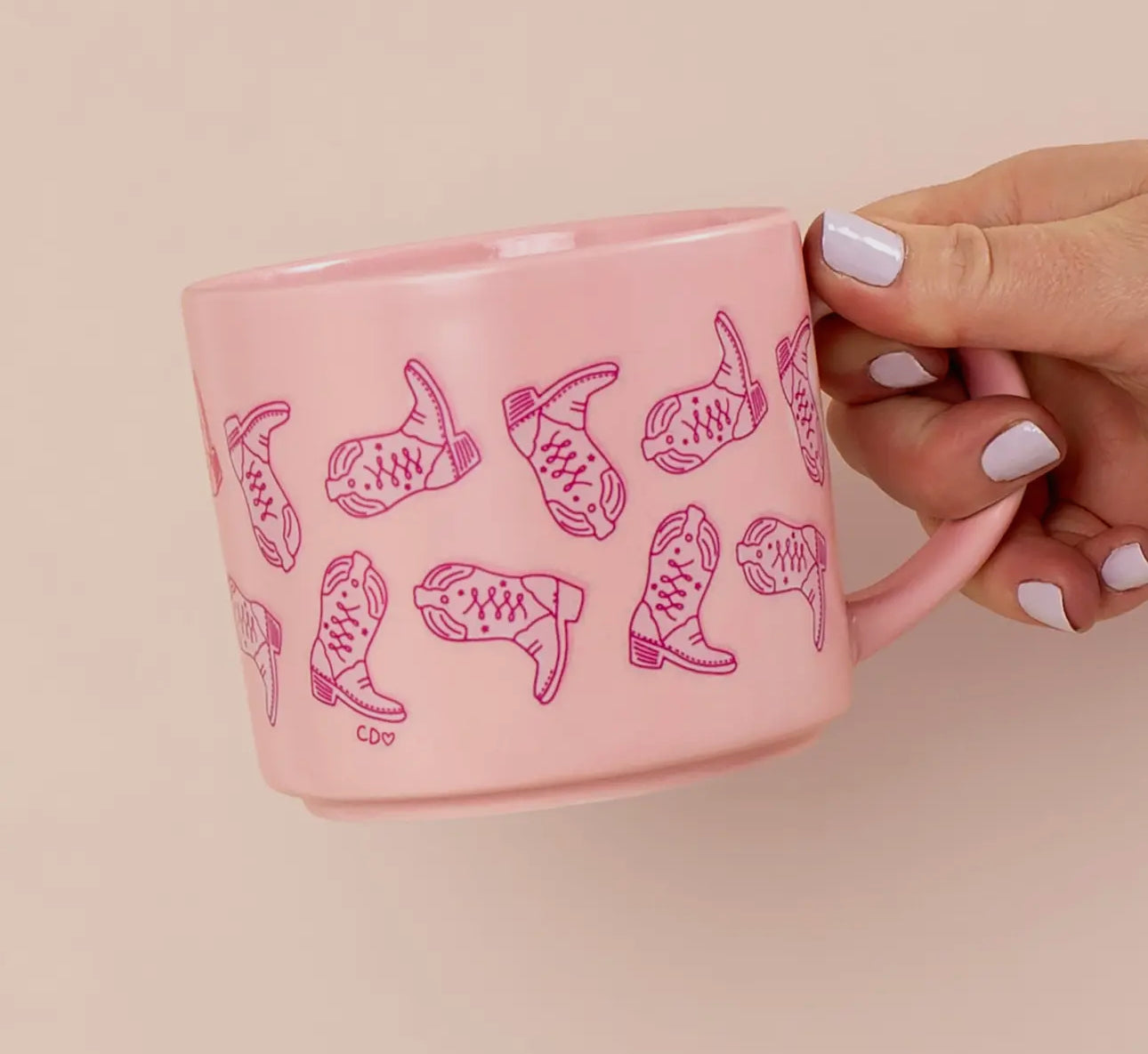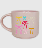 A charming pink coffee cup features a whimsical design of stylish pink boots, creating a playful and trendy look or choose from a pink coffee cup adorned with delicate multicolored bows, including intricately styled croquet bows in shades of blue, yellow, green, and pink. Together, these cups exude a sweet and cheerful aesthetic, perfect for adding a touch of fun and personality to any coffee break.