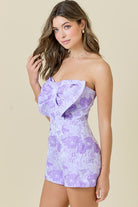 Step into the spotlight with the Bloom Babe Romper, the ultimate outfit for flirty, fearless college vibes! This strapless stunner features a gorgeous floral jacquard pattern that’s all about texture and elegance, while the fixed bow detail at the front adds a playful, feminine touch.