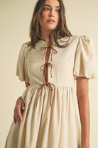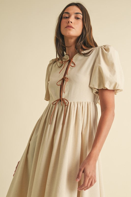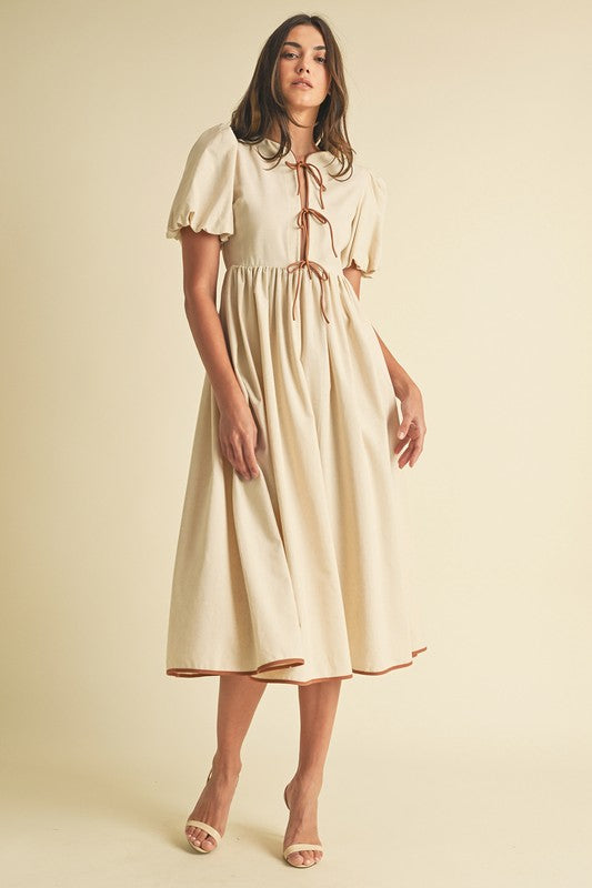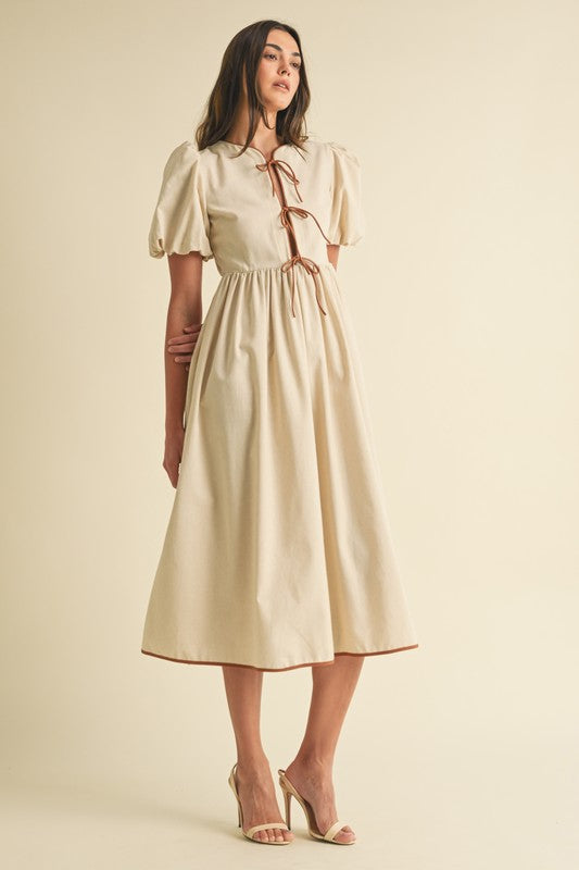 SIZE UP IF BETWEEN SIZES. Step into style with this bow-tie midi dress that’s as fun as it is versatile! Made from soft, breathable linen and fully lined, this dress features adorable puff short sleeves and contrast binding that adds a chic pop. The flirty bow tie detail brings a touch of sweetness, making it perfect for workdays that roll into nights out. Whether you’re dressing it up with heels or keeping it cute with flats, this midi dress is all about effortless charm and confidence!