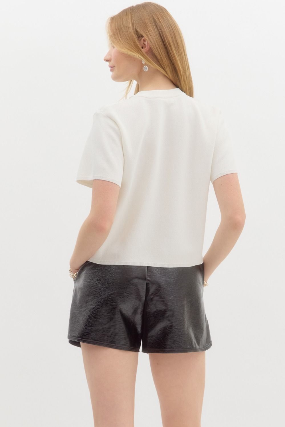 Bow embellished short sleeve sweater knit pullover. Unlined. Knit. Non-sheer. Lightweight.