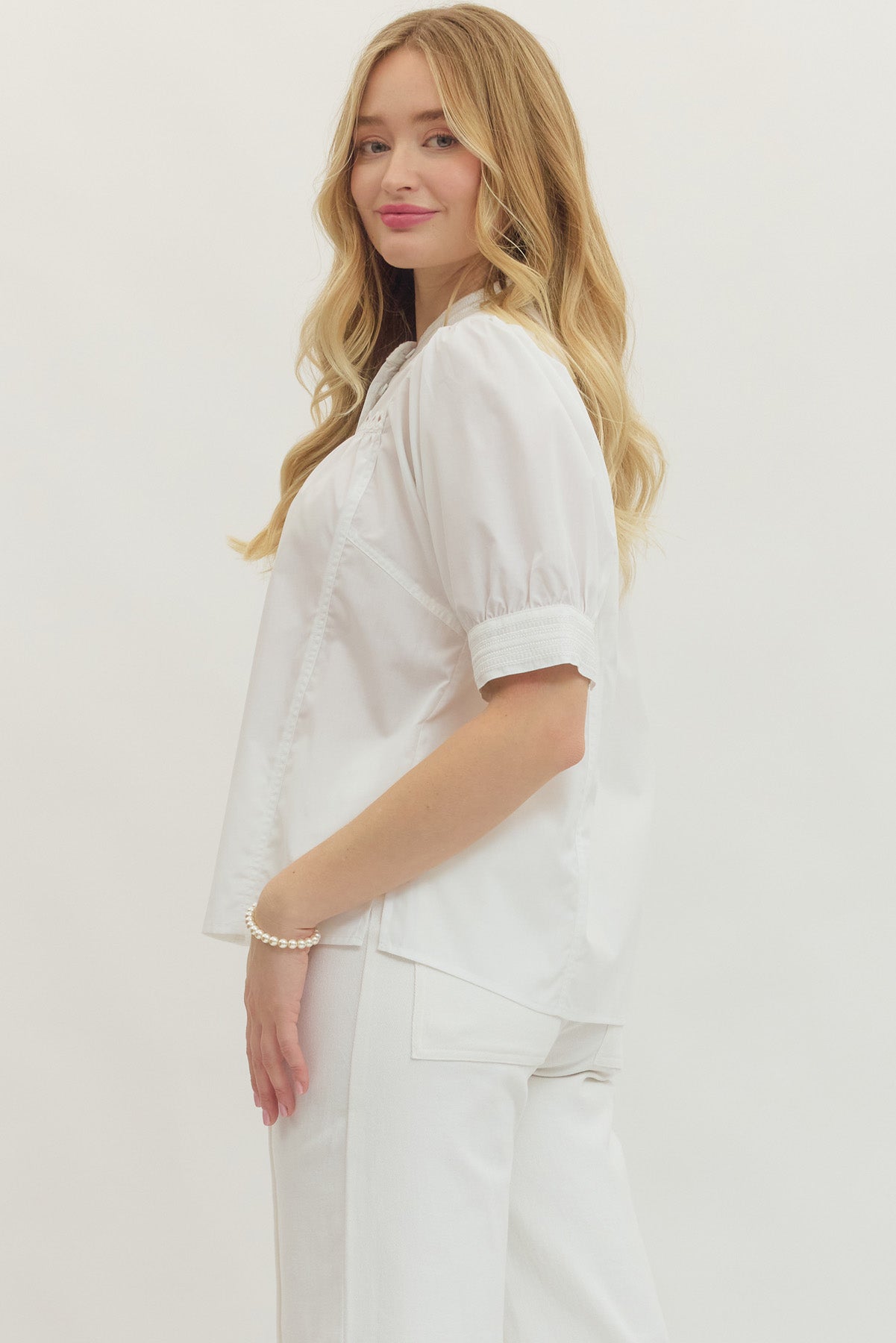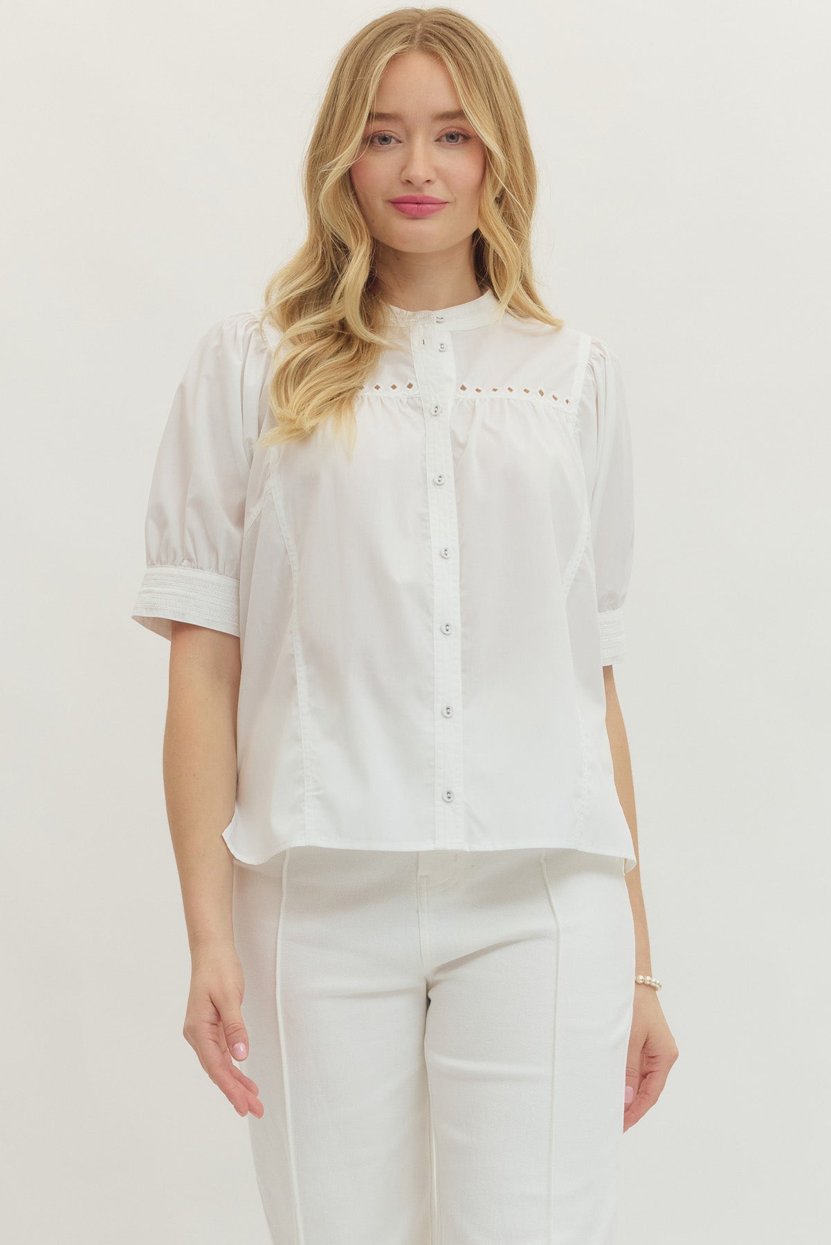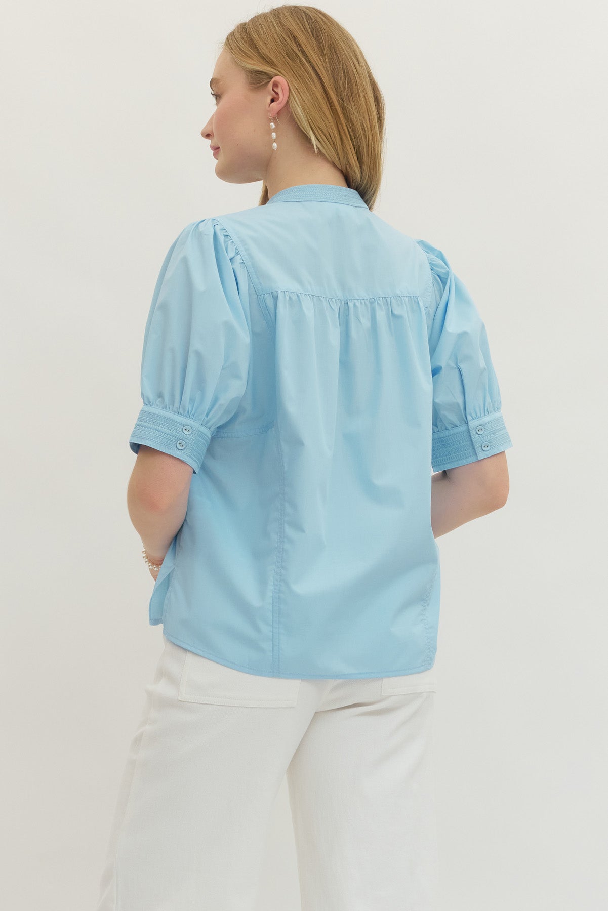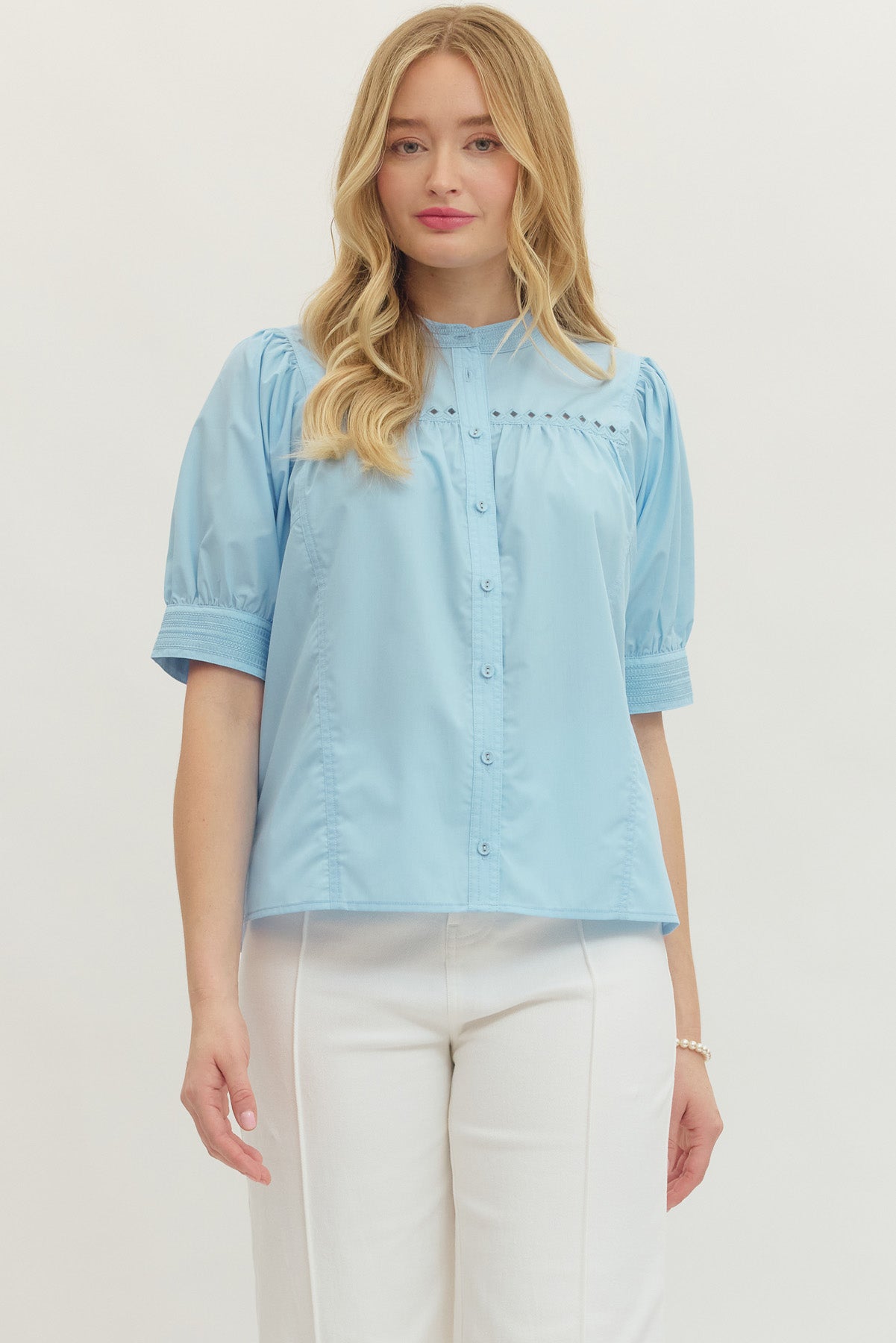 This elevated everyday top features functional buttons down the front and soft puff sleeves for a feminine touch. Designed with a polished yet easy silhouette, it’s the perfect balance of classic and modern. Available in multiple colors, this versatile piece dresses up denim or pairs effortlessly with tailored bottoms for a refined, wear-anywhere look.