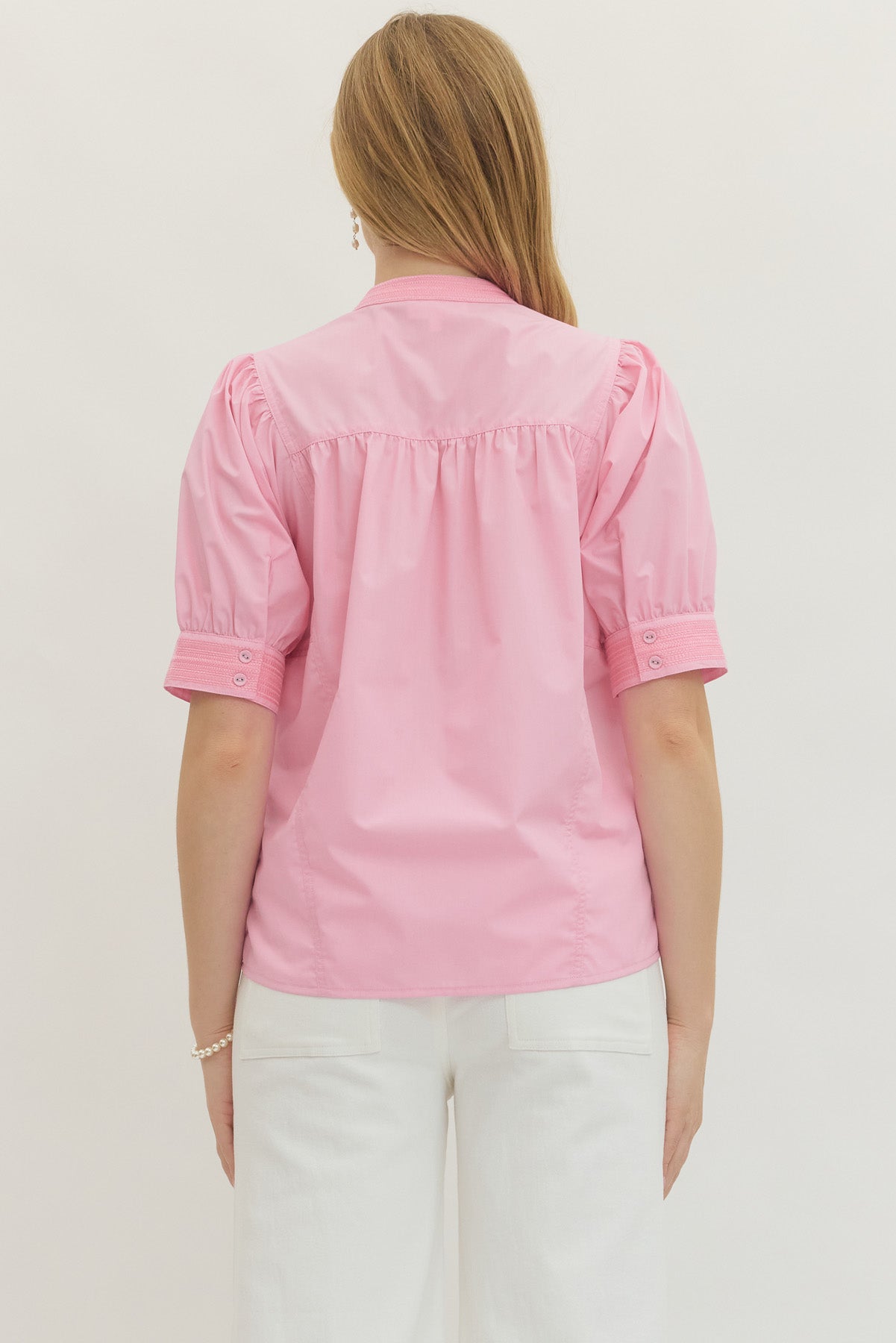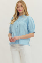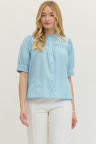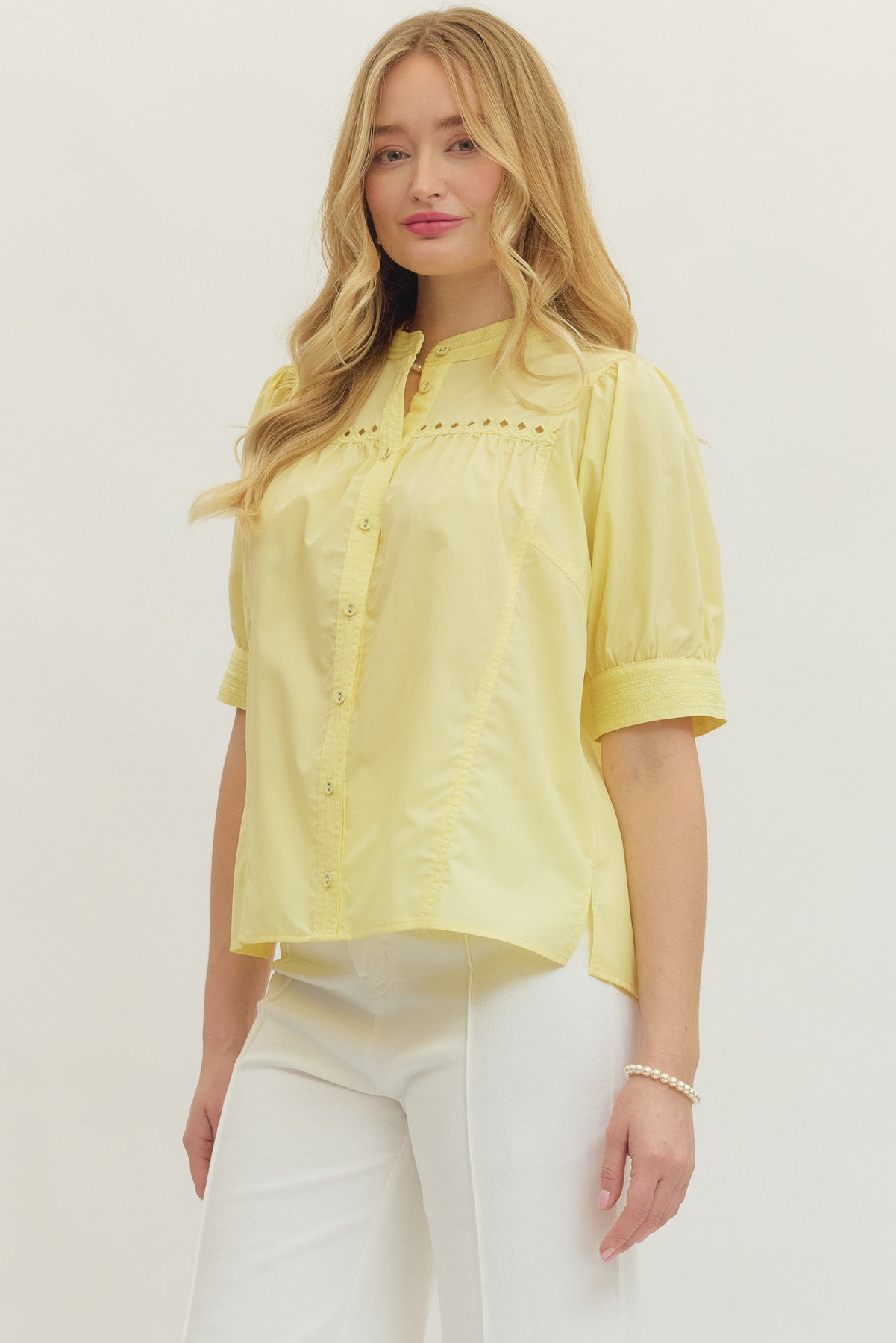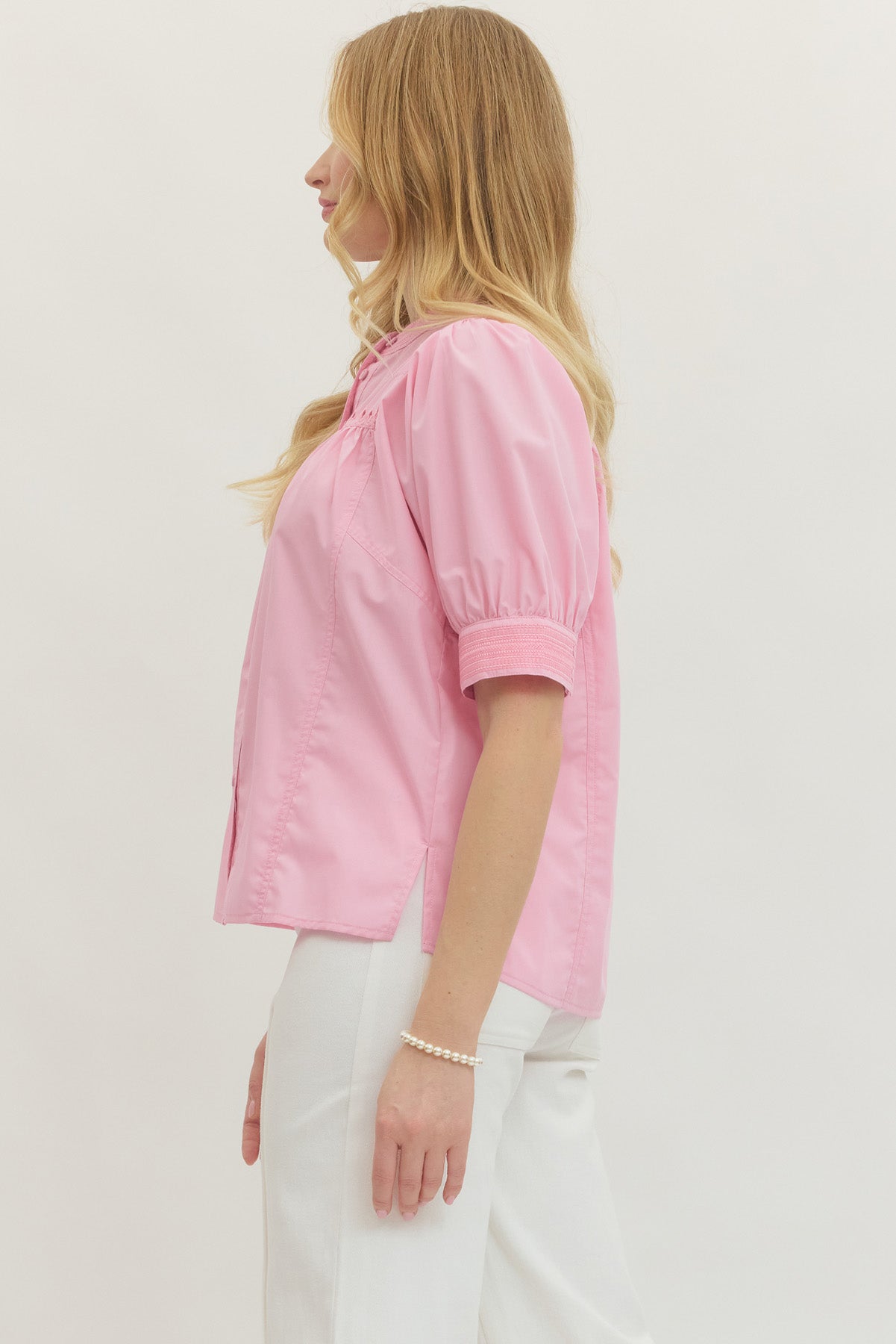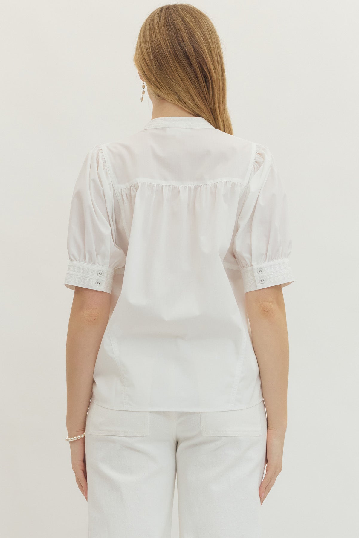 This elevated everyday top features functional buttons down the front and soft puff sleeves for a feminine touch. Designed with a polished yet easy silhouette, it’s the perfect balance of classic and modern. Available in multiple colors, this versatile piece dresses up denim or pairs effortlessly with tailored bottoms for a refined, wear-anywhere look.