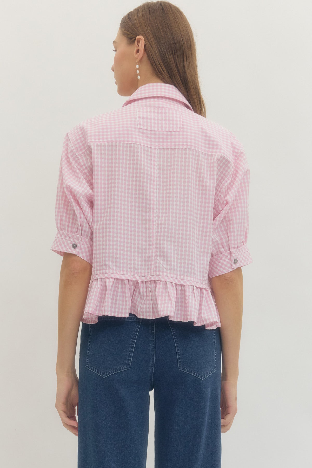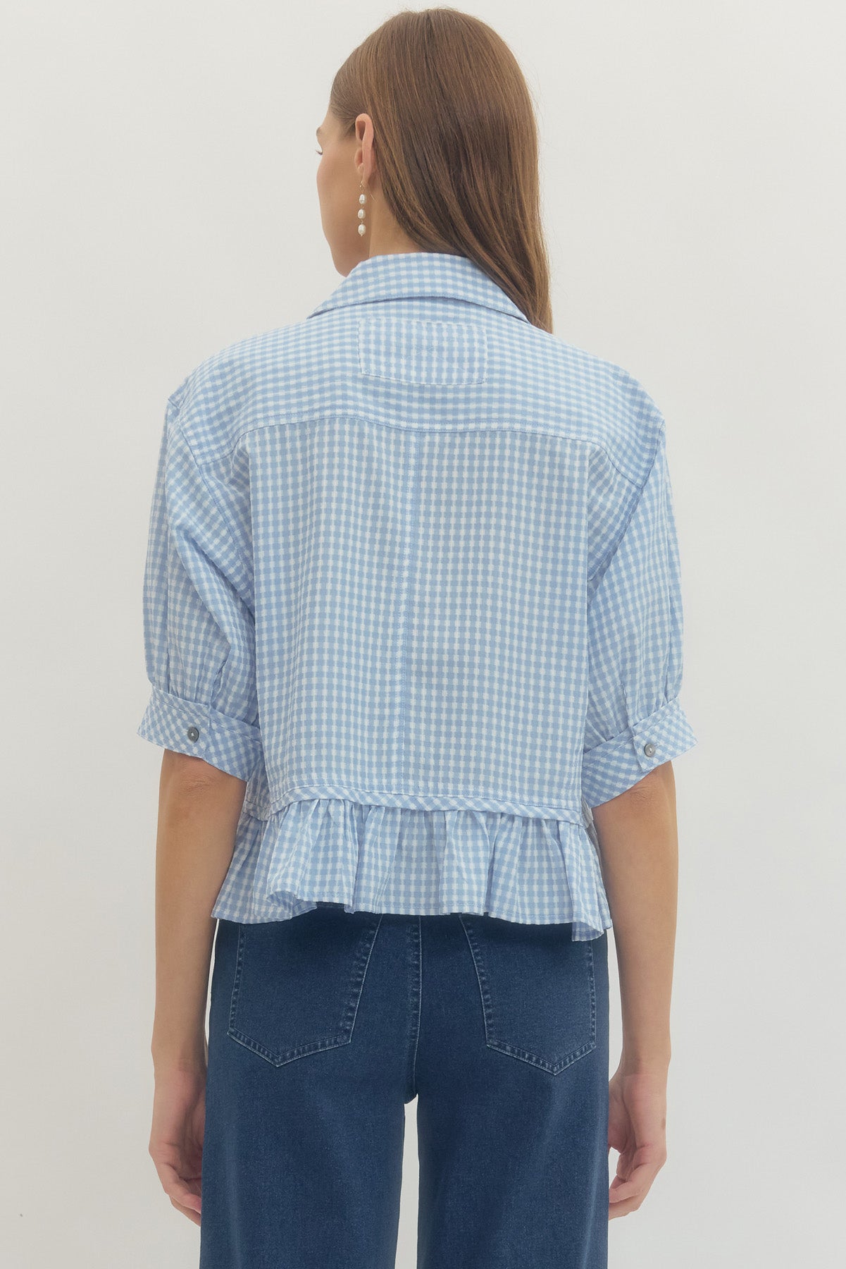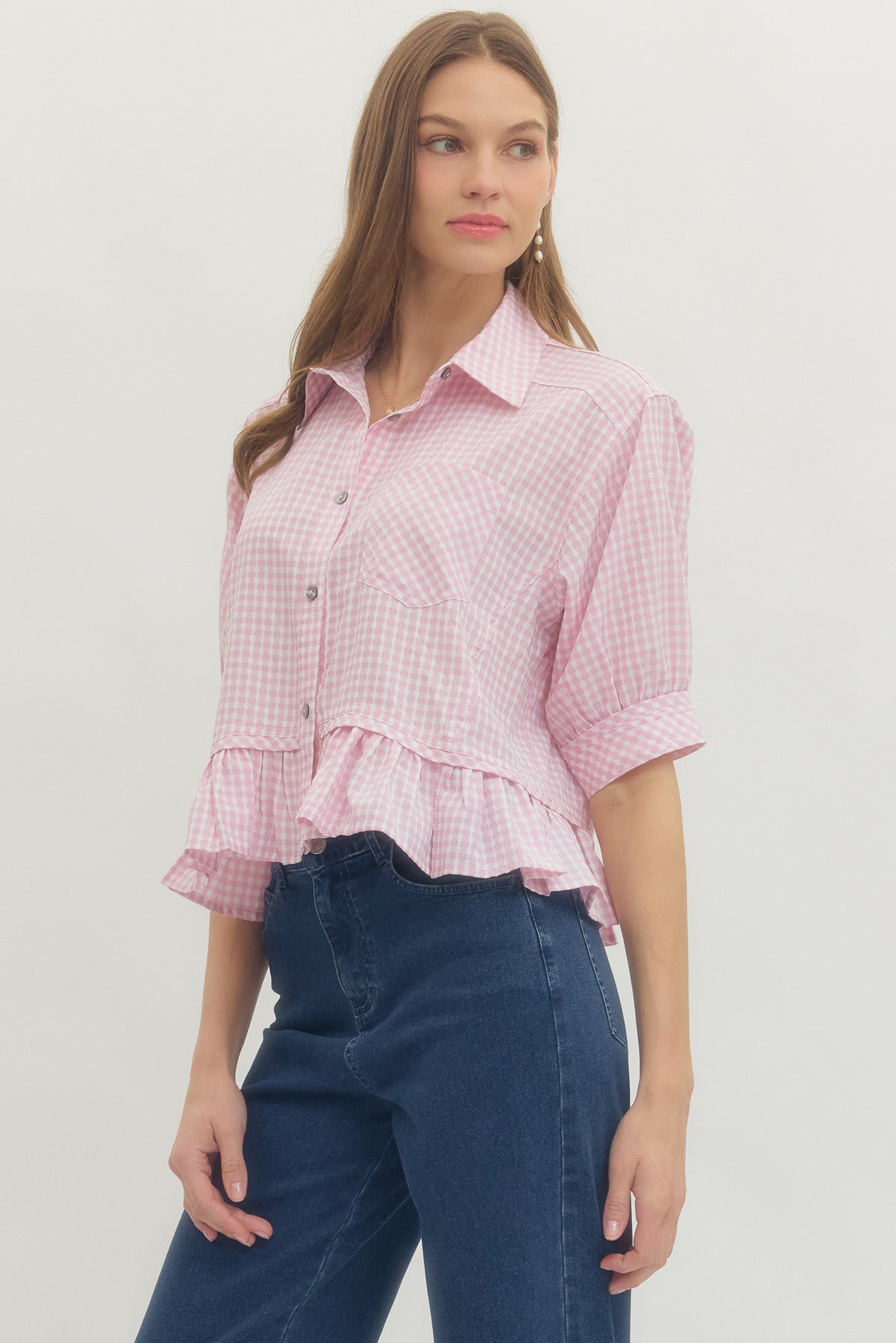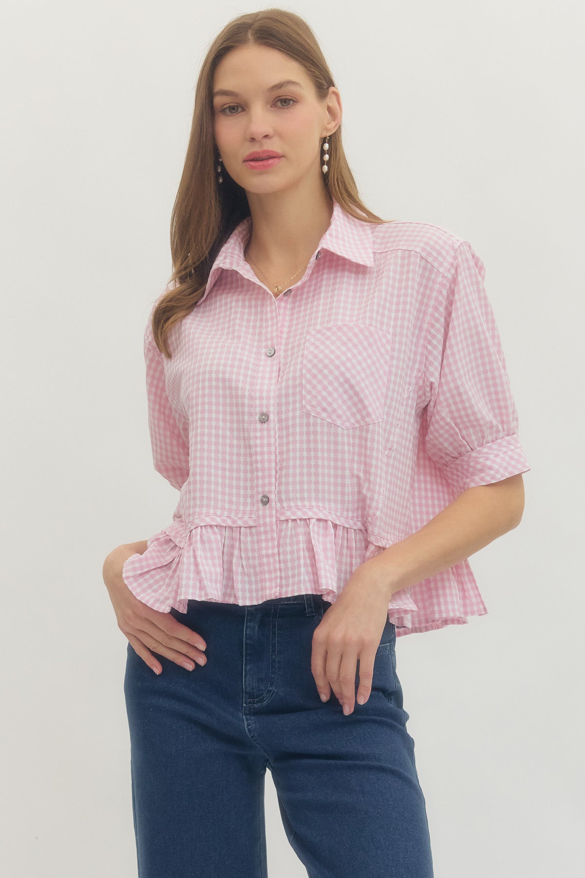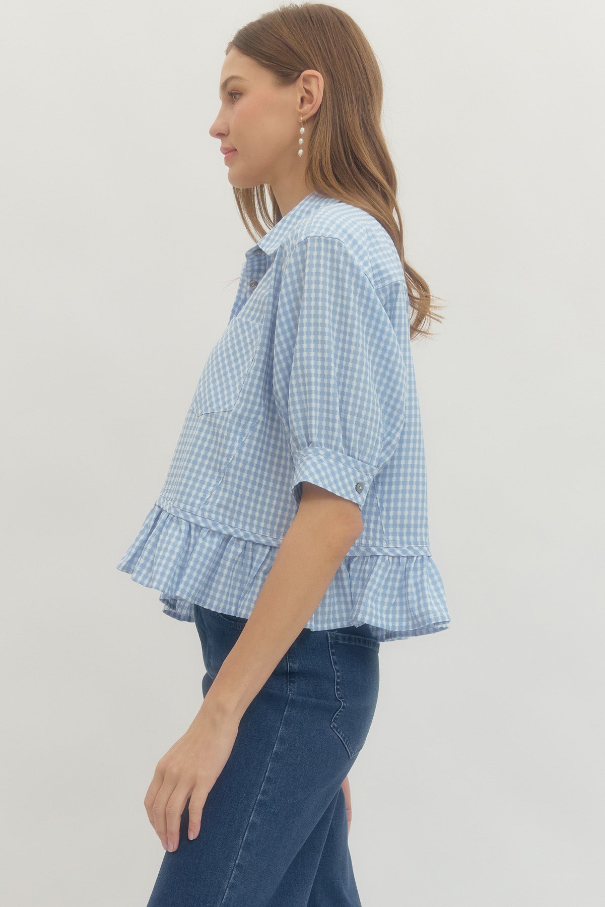 This gingham top features a flattering ruffled hem that adds movement and charm to a timeless silhouette. Designed with functional buttons down the front and easy length short sleeves, it blends classic detail with everyday wearability. Available in light blue gingham and light pink gingham, this piece is perfect for pairing with denim or dressed-up casual looks.
