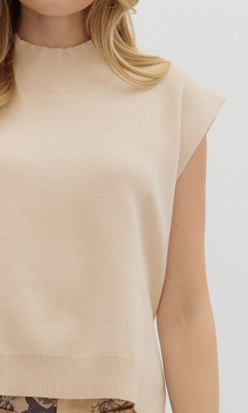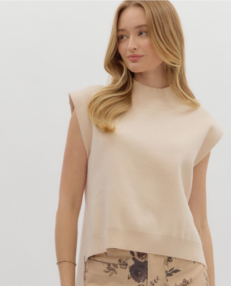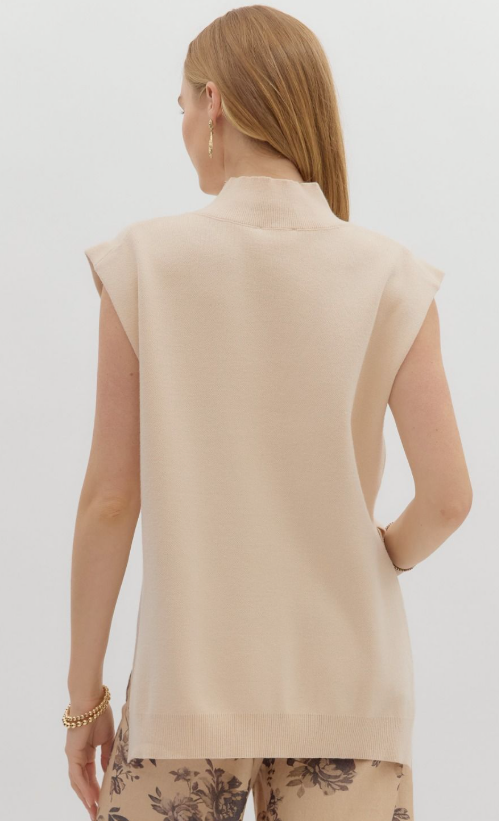 Say hello to effortless layering with this solid mock neck muscle tee sweater in a soft oatmeal hue. Designed with a flattering high-low hem and side slits for easy movement, this lightweight knit is unlined and breathable—perfect for transitioning through the seasons. The muscle tee silhouette adds a modern edge, while the mock neck keeps it polished. Throw it on with denim or layer it over a dress for an elevated, everyday look.
