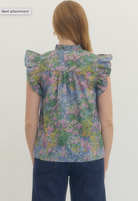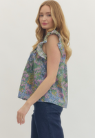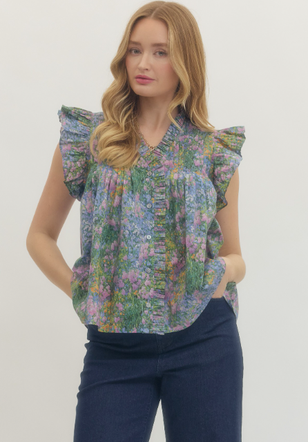This effortless blouse features soft flutter sleeves and a relaxed, airy silhouette for a feminine yet easygoing feel. Designed with a flattering V-neckline and button-front detail, it’s finished with a delicate ruffle trim that adds subtle texture and charm. The allover painterly floral print brings depth and color, making this top a standout piece that pairs beautifully with denim, trousers, or skirts for everyday polish.