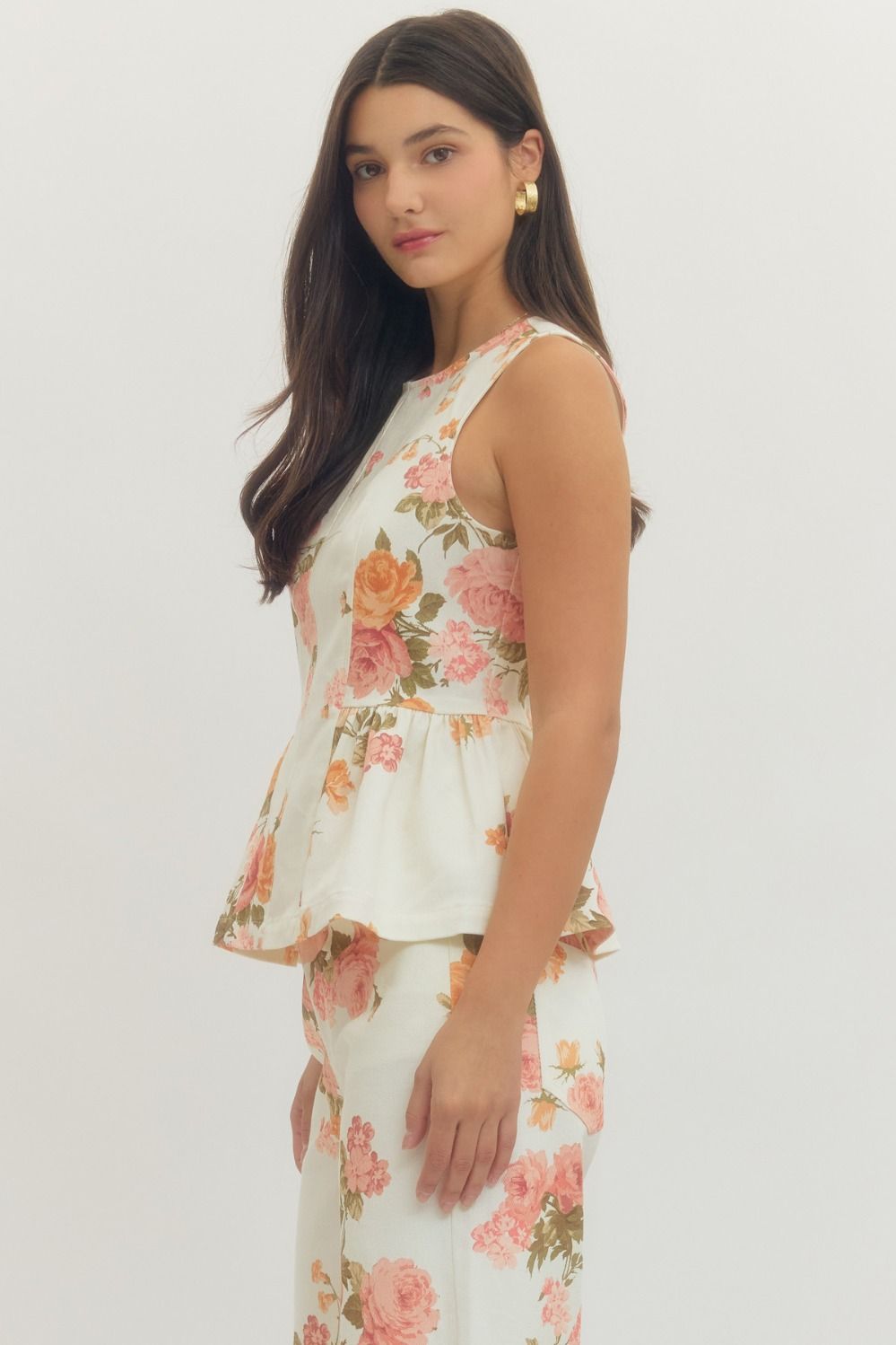 Soft, feminine, and effortlessly polished — the Petal & Poise Floral Top is made for spring days that call for easy charm. Featuring a beautiful ecru base sprinkled with delicate peach and pink florals, this matching set brings a fresh, romantic feel. The peplum top flatters with a gentle flare at the waist, while the structured pant adds a tailored touch for a perfectly balanced silhouette. Worn together or styled separately, this set is equal parts sweet and sophisticated — ideal for brunch dates, showers, or sunny strolls.