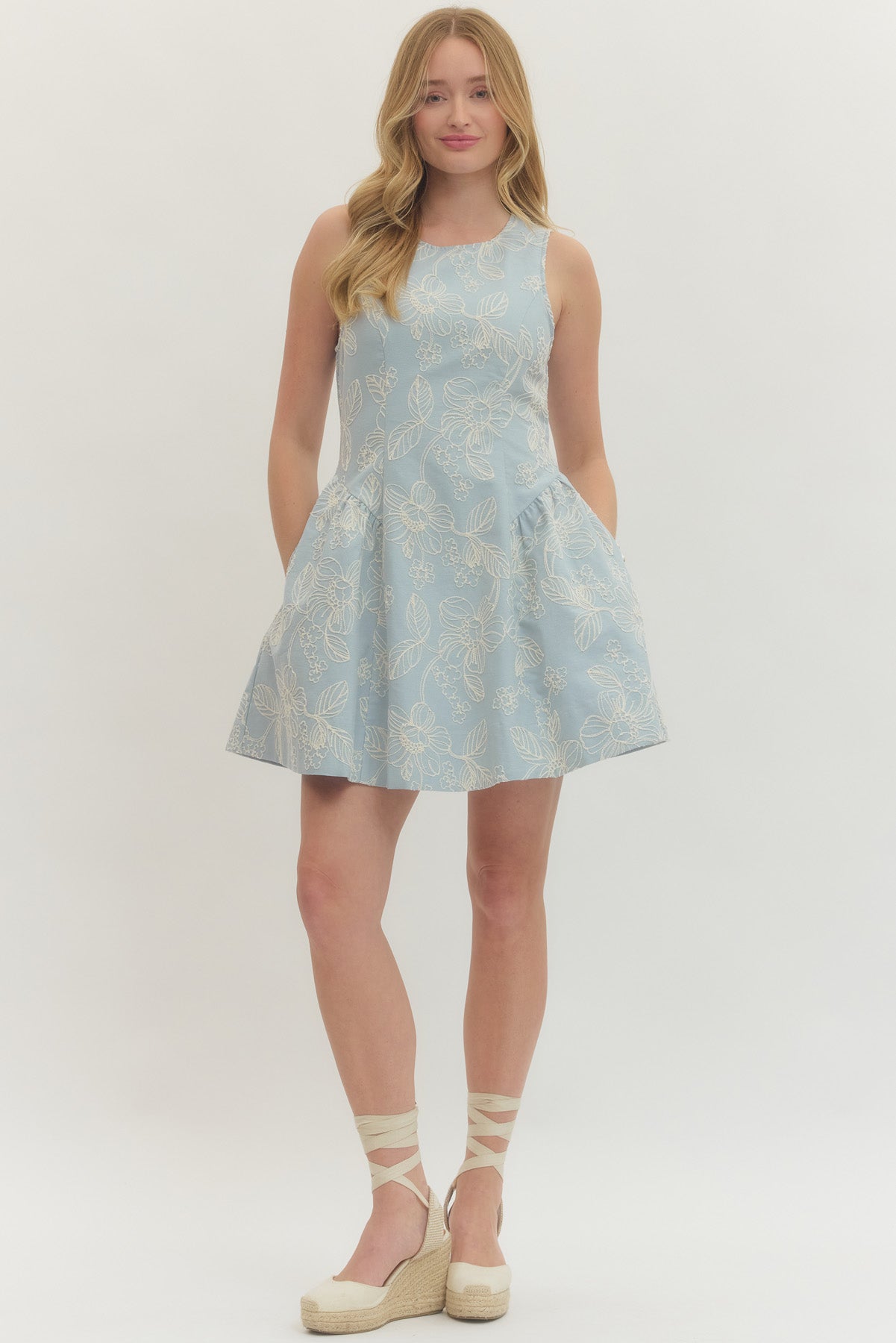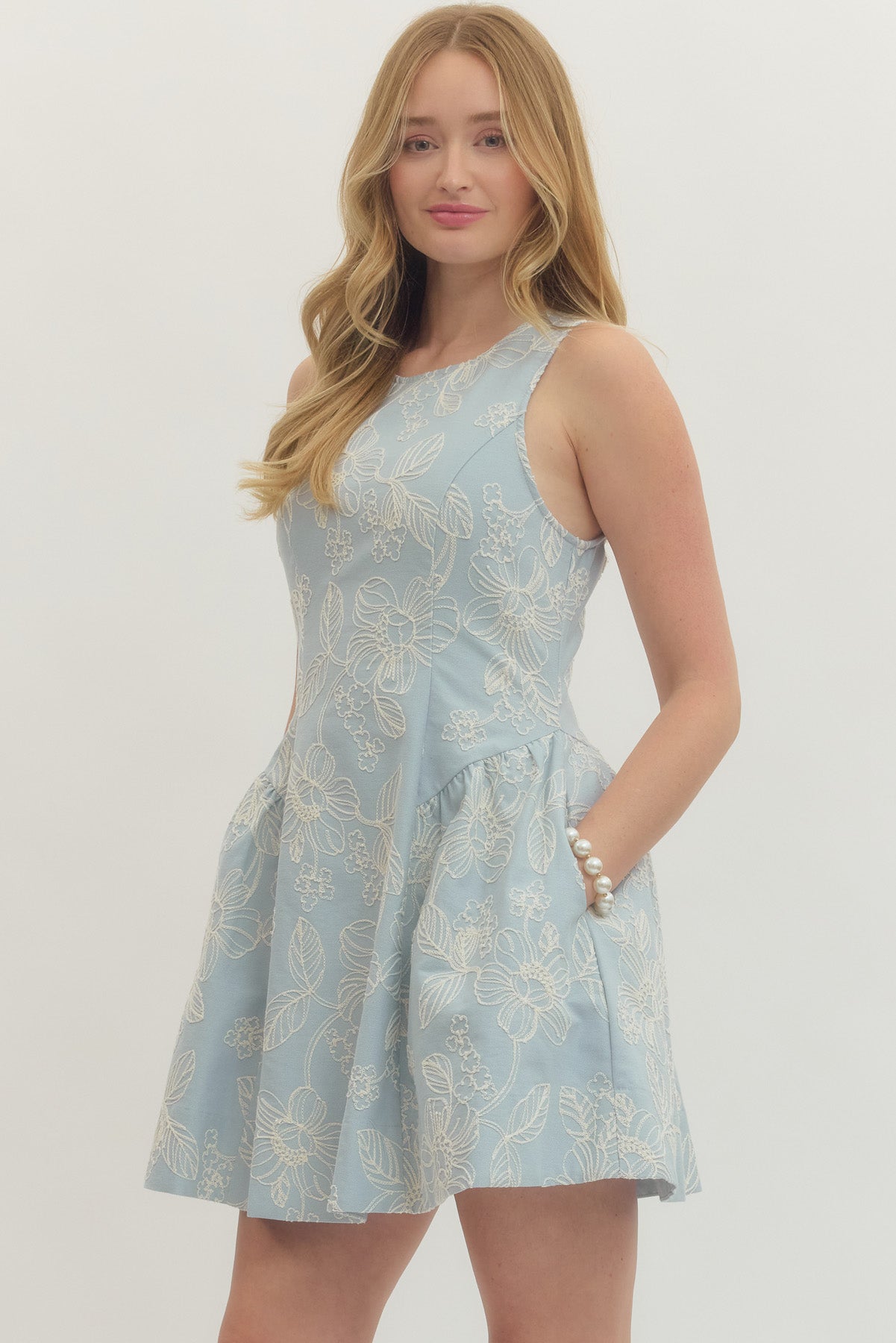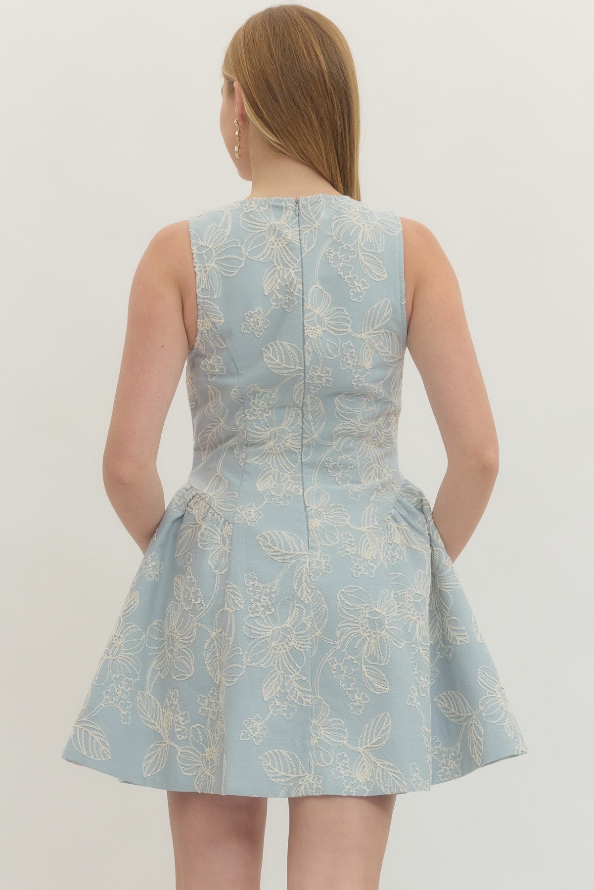 Sweet, sophisticated, and effortlessly feminine — this embroidered fit-and-flare dress is made for standout moments. Designed in a soft dusty blue hue, it features delicate ivory floral embroidery throughout, creating a romantic, textured look with timeless charm.