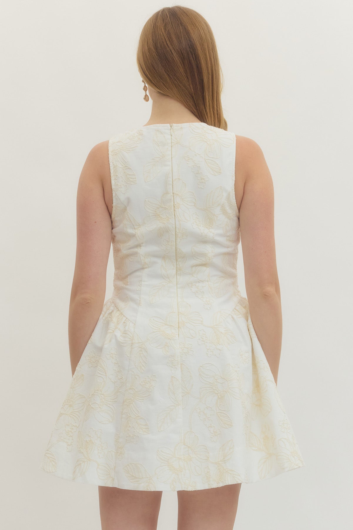 The sleeveless bodice offers a clean, flattering silhouette, while the fitted waist flows into a flared skirt that moves beautifully with every step. The intricate floral detailing adds dimension and elegance, making it perfect for bridal showers, garden parties, spring weddings, or special occasions.