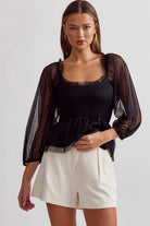 This sheer Swiss dot long-sleeve peplum top is the perfect blend of sweet and chic. The smocked bodice flatters your shape while keeping it comfy, and the delicate ruffle detail along the neckline adds a romantic touch. The peplum hem creates a feminine silhouette, and the lightweight woven fabric gives it an airy feel. Fully lined in the bodice and semi-sheer in the sleeves, it’s just the right amount of flirty sophistication.