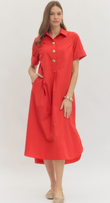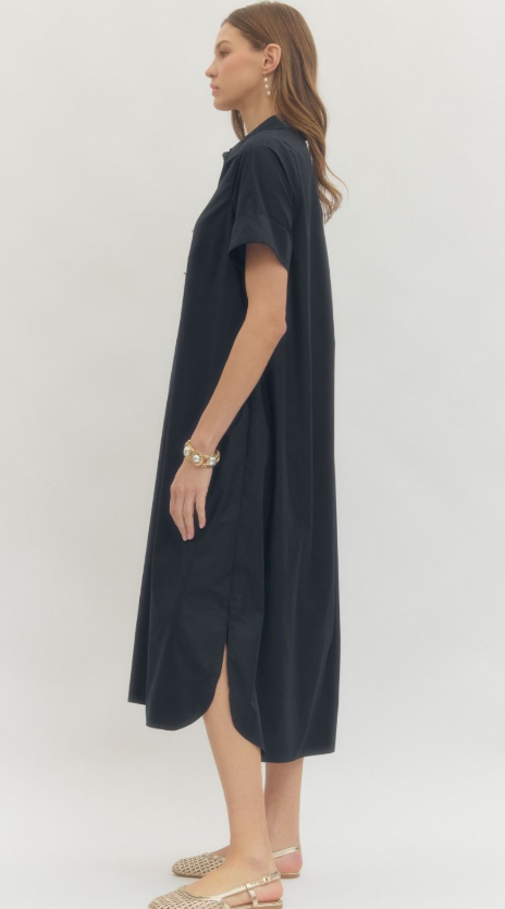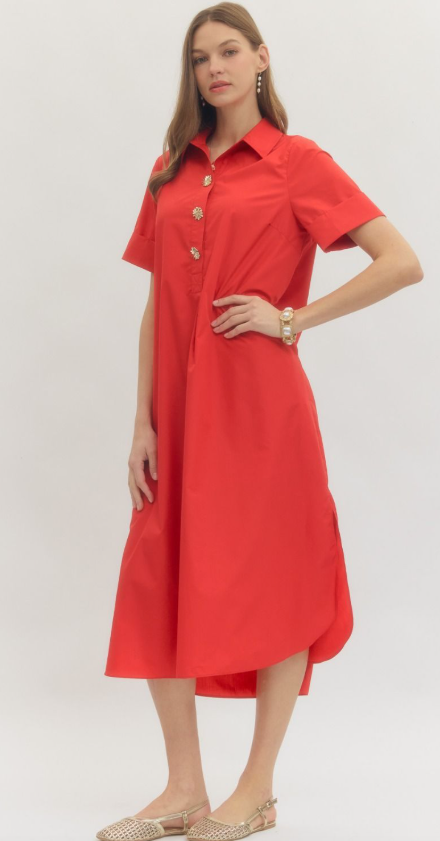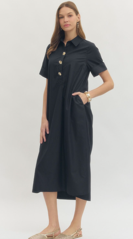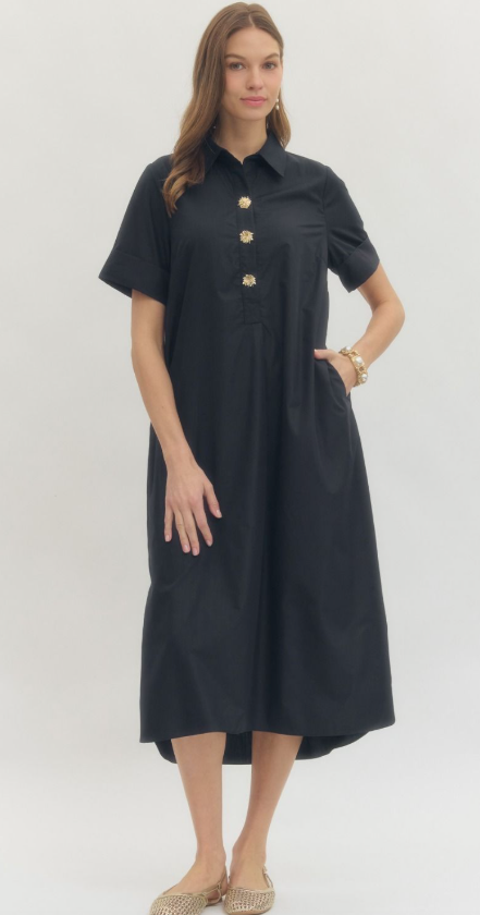A timeless midi dress with an elevated, modern silhouette, featuring a subtle high-low hem that’s longer in the back for graceful movement. Designed with classic sleeves and a structured collar, this piece feels polished yet effortless. The standout detail is the row of unique gold buttons down the front, adding just the right touch of sophistication and shine. Clean, simple, and endlessly chic—this is the kind of dress that transitions seamlessly from day to night with ease.