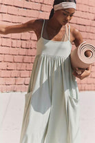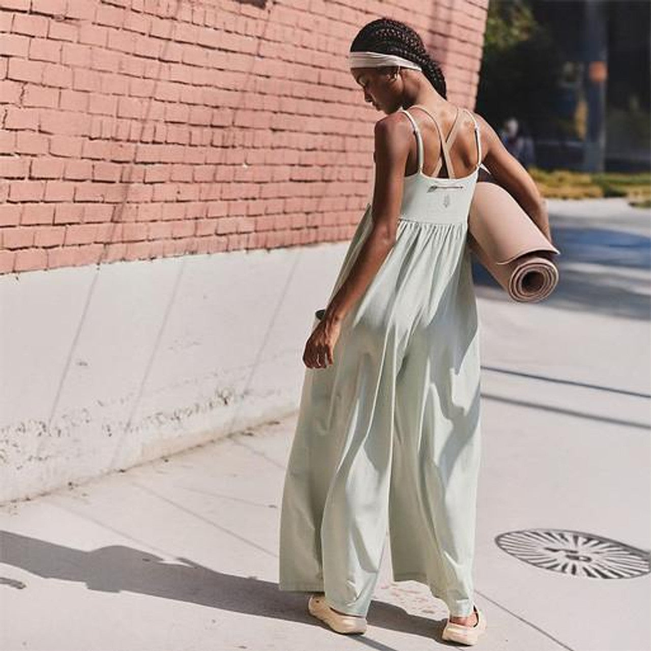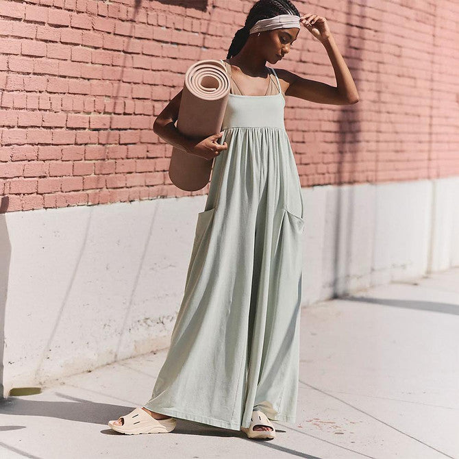 Features: Pull-on silhouette; slightly fitted, square-neck bodice; adjustable, spaghetti-style straps; pleated detailing at empire waist; slouchy patch pockets; oversized, wide legs; zipped logo pocket at back.