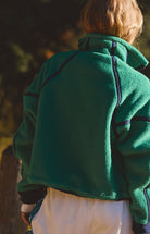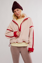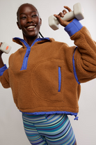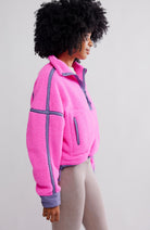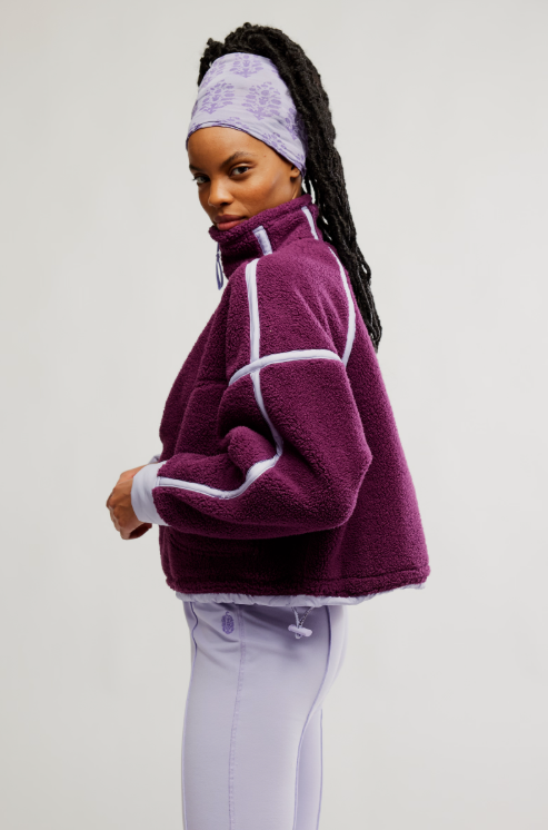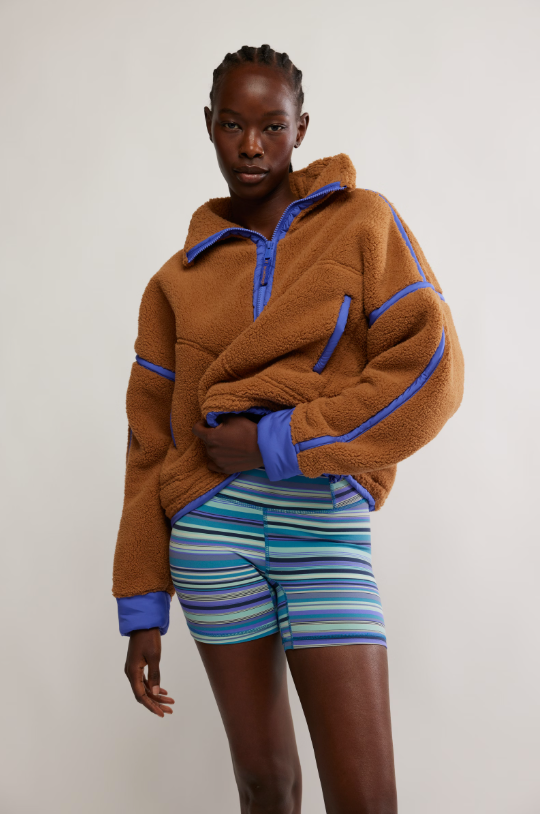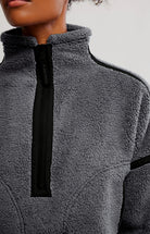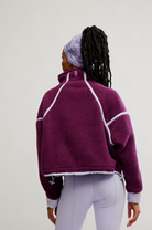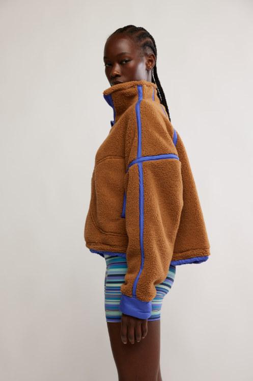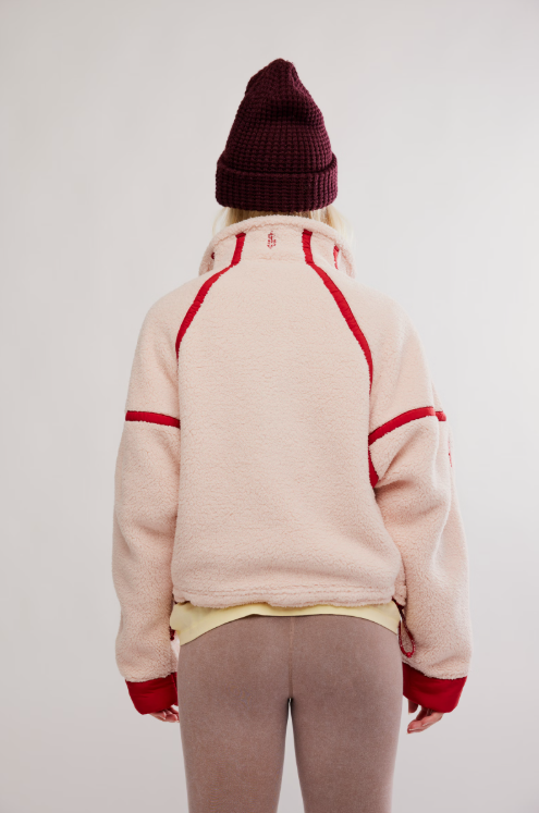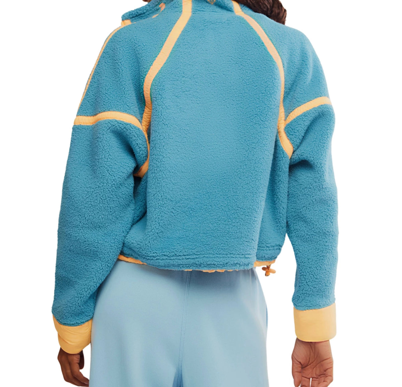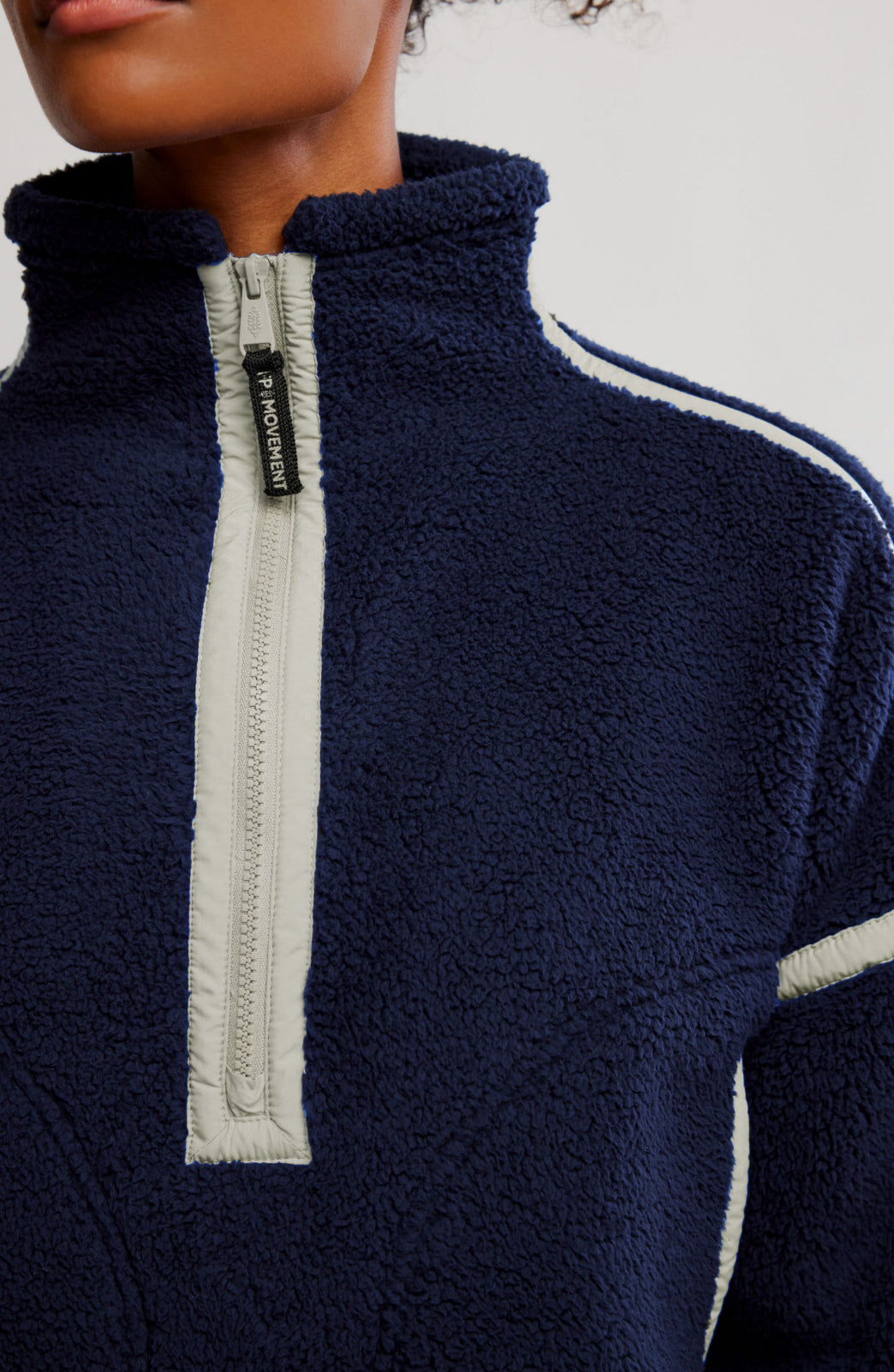 Cozy fleece pullover featuring a half-zip closure and high neckline with bold contrast seams throughout and an adjustable hemline.