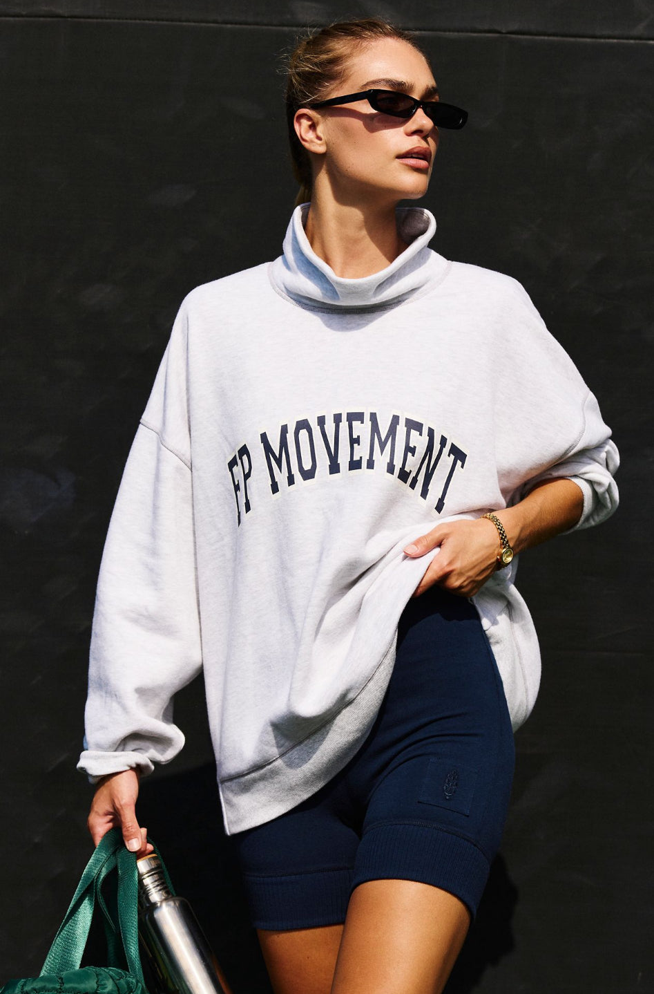 Features: Pullover; Funnel neckline, dropped shoulder seams, collegiate FP Movement logo at the front; Shorts: Pull-on design, ribbed trimming, mid-thigh length, stretch fit