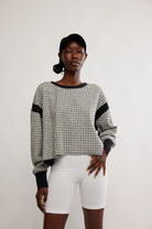 Features: Slight crop, longer sides; wide neckline; open-cut back; ribbed wrist detail