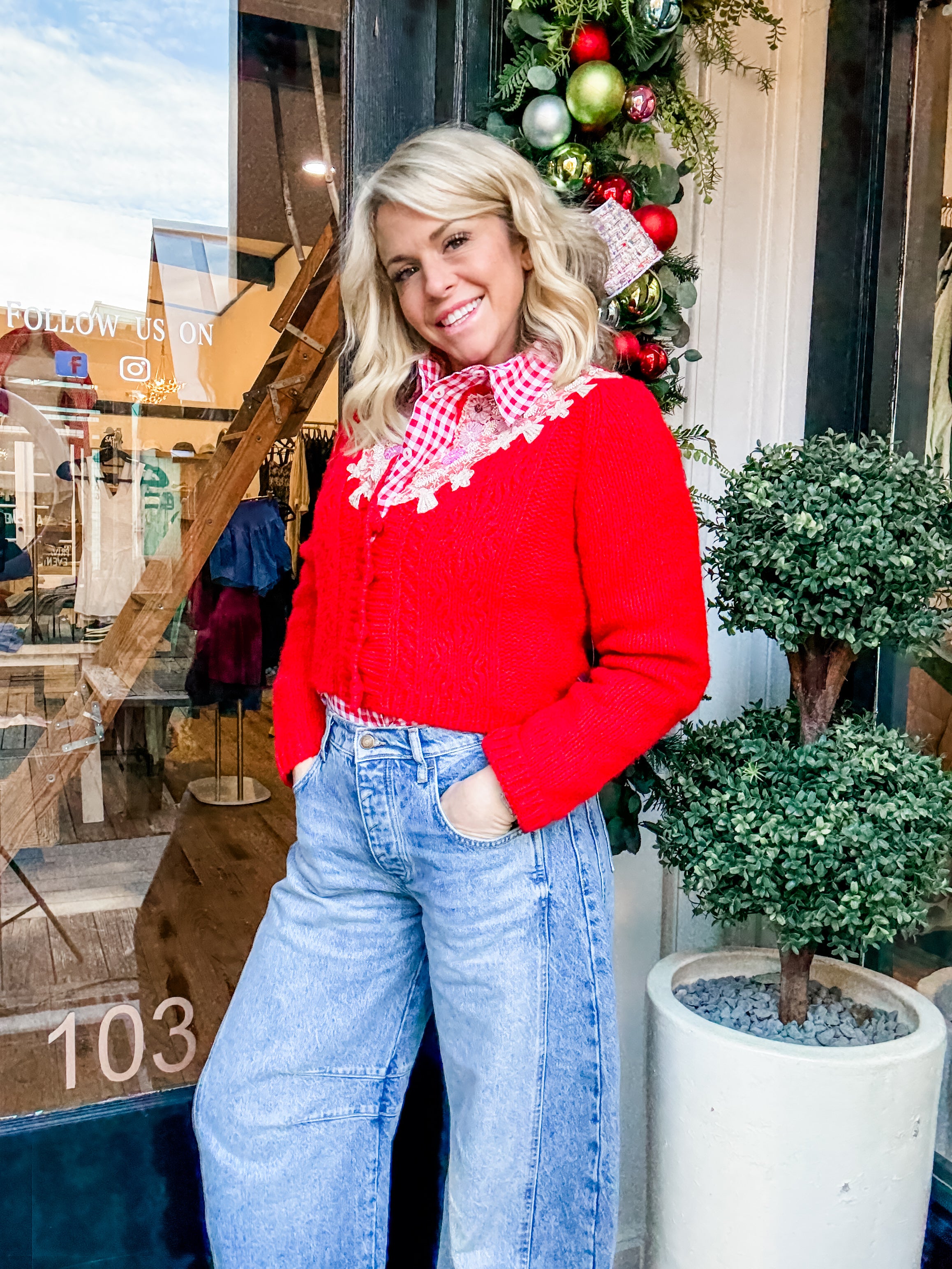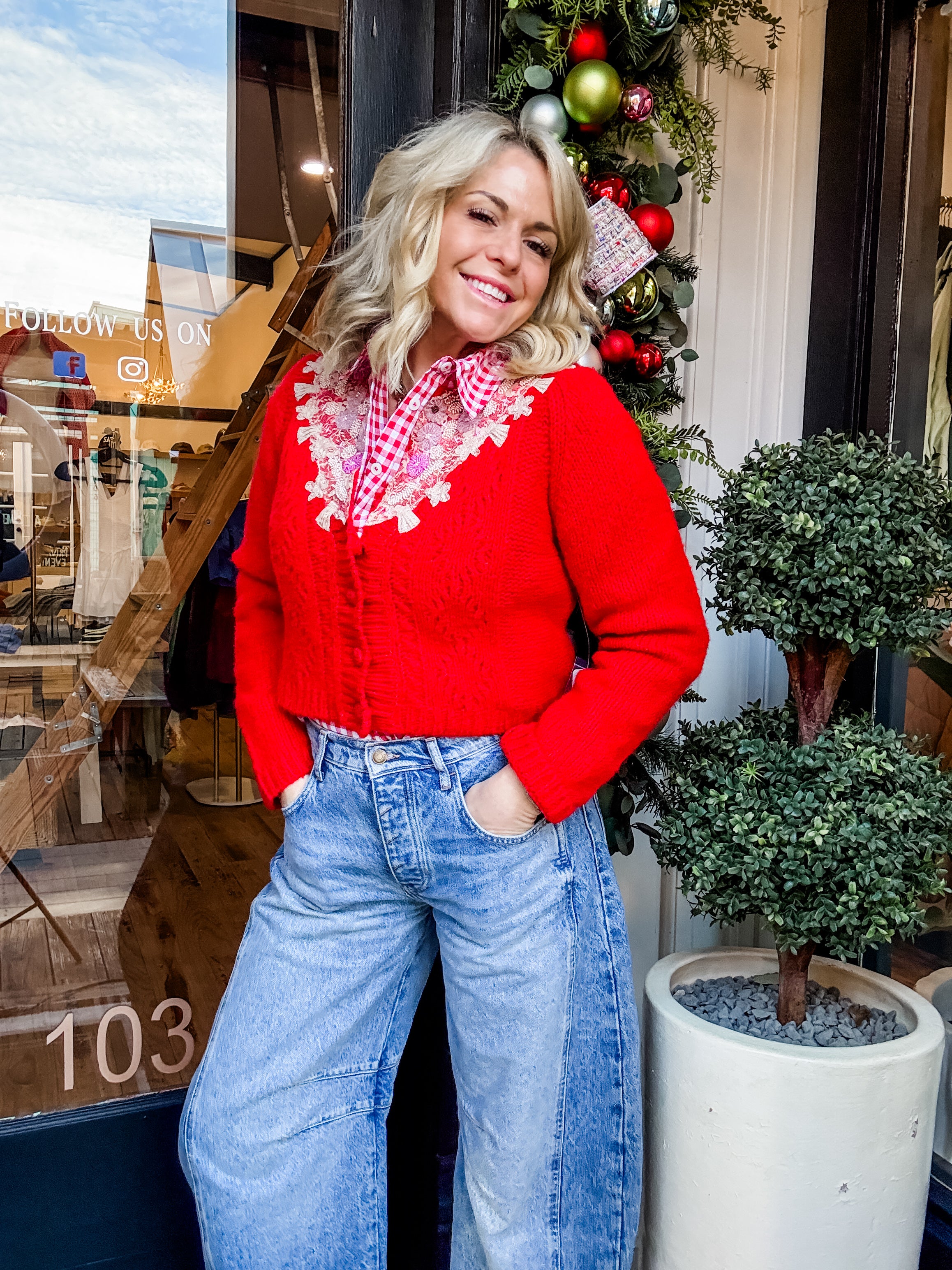 This vibrant red sweater features a chunky knit design with a cozy, textured pattern throughout. It has a cropped fit that adds a modern, trendy touch. The standout detail is the intricate embroidered floral embellishment along the neckline and shoulders, showcasing shades of pink and cream with delicate lace accents. The sweater closes with matching red buttons down the front, blending seamlessly into the knit. Perfect for layering over a simple top, this sweater combines bold color with feminine, artistic detailing for a stylish and unique look.