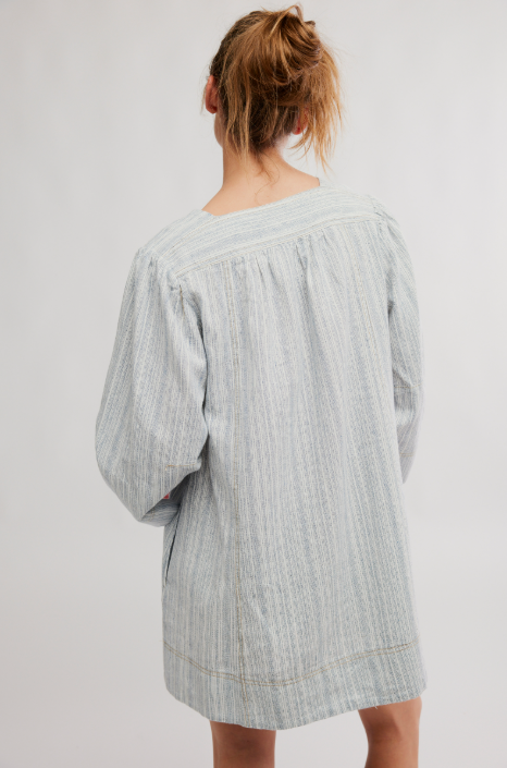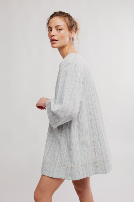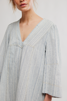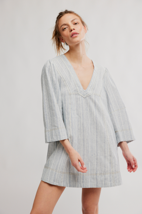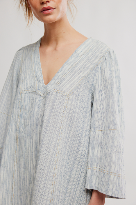 An easy, throw-on dress with quiet charm. This relaxed V-neck dress is crafted from a lightweight, softly textured fabric that drapes beautifully without clinging. The loose silhouette is balanced by subtle detailing, including a stitched V-panel at the neckline and gently flared three-quarter sleeves. A delicate lace trim peeks out at the hem, adding a touch of femininity to the otherwise understated design. Easy to dress up with boots or keep casual with sandals, this is a wear-anywhere staple you’ll reach for again and again.