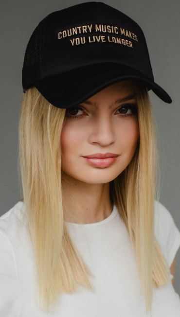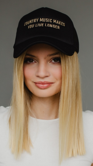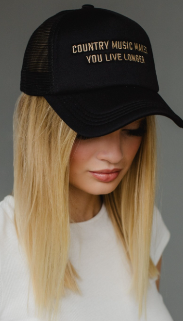 Top off any look with this classic black trucker hat featuring tan embroidered text that reads “Country Music Makes You Live Longer.” Designed with a structured front and breathable mesh back, this hat blends everyday comfort with laid-back country style.