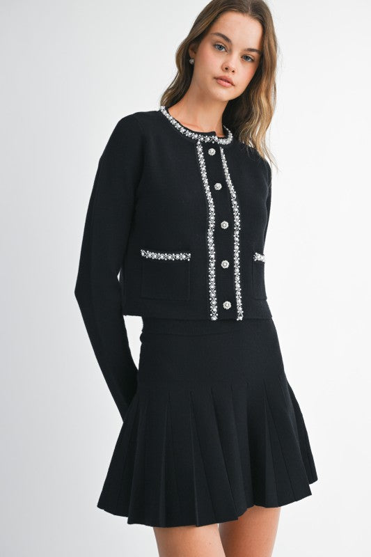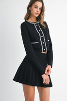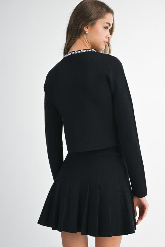Elegance meets festive flair in this black sweater set featuring luxe pearl beaded details. The cardigan stuns with delicate pearl accents and a flattering fit, while the matching pleated mini skirt brings movement and charm. Made from cozy sweater knit, it’s as comfortable as it is dazzling—perfect for holiday parties, winter dinners, and every celebration in between.